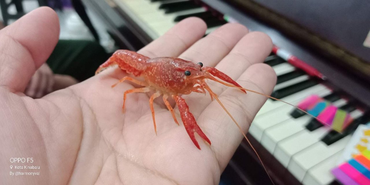 It is a type of crayfish, I bought Lobbie when it was a small li'l fella like 0.6cm x 3cm...... Now, after one shedding, it is measured at 1cm x 5cm... Yes, Lobbie needs to be in a shallow water. About 2cm height of water is enough. He likes his stones and rocks around him. Lobbie likes to dine on earth worms. Otherwise his sinking pellets will do. It is a feisty little chap, tried to pinch my finger a few times. Hahaha... I play with it by stroking him and he challenged me with his pinchers. All my students will look for him and stare at him for a long time when they come for lesson.  Previous photos back in June...  Small chap... This photo was early June... It was when he was still a little afraid. I hope we all do something to contribute to mother nature - love the creatures. Posted using [Partiko Android](https://partiko.app/referral/harmonyval)