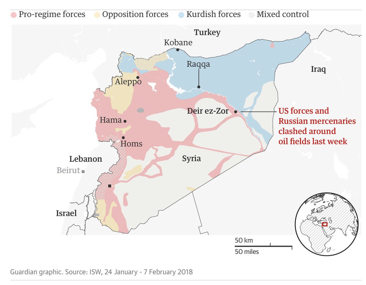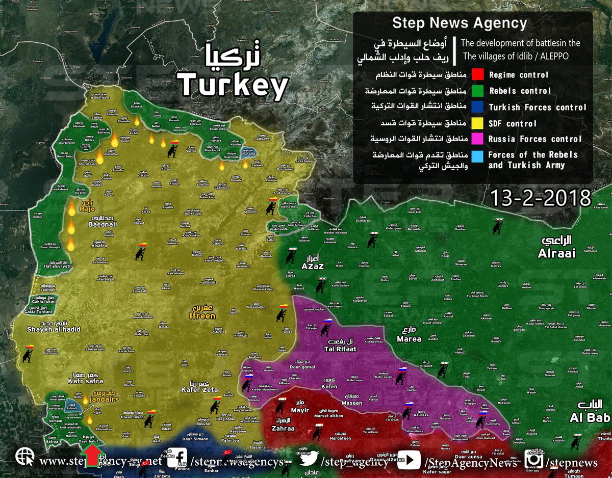 * Turk Army and Turk backed rebels captured more areas in Afrin enclave.  They have capture nearby villages of Jandares town and Turk soldiers secialized in urban attack have also arrived on these fronts for upcoming attack on Jandares town. Euphrates shield groups trying to connect their areas near Manbij to Idlib province through captured territories from Kurds in Afrin.  * A monitoring group revealed that total of 15 Russian mercenaries had died in clashes with US backed SDF (Dyrian Democratic Forces) Kurd forces last week. The mercenaries were died of arms depot explosion during clashes.  * Large number of Syrian forces and foreign militias have arrived in Euphrates valley for an upcoming operation against US backed SDF forces. Last week attack didn't played well as US air force bombed the advancing forces and killed 100-200 pro-Assad Syrian, Iranian and Russian fighters in the attack. * Rebels have transferred arrested 370 IS members to secret prisons and have started interrogation about their crimes. IS members were captured two days ago after 4 months of fights in the region.  * Turkey have released video of destroying Iran made jeep which was handed to YPG Kurd groups last week. Turk drones tracked the jeep and destroyed YPG's garage with dozens fighters and vehicles. https://www.youtube.com/watch?v=XvbK0DYGkYQ source: [1](https://www.theguardian.com/world/2018/feb/15/fifteen-russian-security-staff-killed-in-syria-explosion?CMP=share_btn_tw), [2](https://twitter.com/CivilWarMap), [3](https://twitter.com/QalaatAlMudiq).