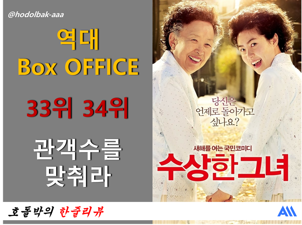 안녕하세요. @hodolbak-aaa (호돌박) 입니다. 역대 BoxOffice 관객수 맞추기 이벤트 입니다. 박스오피스는 [KOBIS(영화관입장권통합전산망)](http://www.kobis.or.kr) 의 역대 Top200 자료를 기준으로 합니다. (2019년 9월 18일자 기준) 관객수 맞추기는 순위가 빠른 영화 한편을! 영화소개는 두편을! 많은 참가 부탁드립니다^^ --- 오늘의 영화는 '수상한 그녀' 와 '과속 스캔들' 입니다. 두편 모두 재미있게 봤는데요. 수상한 그녀는 눈물찔끔하지 않을 수 밖에 없었습니다. 신은경과 박보영은 두 영화다 OST 를 불렀는데요. OST를 보는재미 듣는재미도 있는 것 같습니다. --- > <sub><strong>1. 참여방법</strong></sub> > <sub>- 영화에 대한 한줄 댓글과 함께 주사위를 돌려주세요.</sub> > <sub>- 주사위가 땡이 나오는 경우 11, 22, 33 등.. 주사위를 다시 한번 돌릴 수 있습니다.</sub> > <sub>- 주사위는 #wdice 로...</sub> > > <sub><strong>2. 보상</strong></sub> > <sub>- 주사위와 관객수 뒷 2자리의 십단위와 일단위 수를 비교 보팅 (30%)</sub> > <sub>- 예시 : 관객수 4,682,61 인 경우 주사위가 6x, x1 인 경우 보팅</sub> > <sub>- 동일 : 100% 보팅</sub> > <sub>- 주 1~2회는 주사위와 상관없이 참여자 전체 보팅 (10~30%)</sub> > > <sub><strong>3. 추가보상</strong></sub> > <sub>- 주사위 숫자가 동일한 경우 500 AAA 지급 (중복 당첨자가 발생한 경우 배분)</sub> > <sub>- 동일 당첨자가 나오지 않는 경우 다음 회차 이월</sub> > > <sub><strong>4. 현재누적당첨금</strong></sub> > <sub><strong>- 4,000 AAA</strong></sub> #### 33위:[수상한 그녀](https://www.themoviedb.org/movie/253065?language=ko-KR) <div class="pull-left"> https://image.tmdb.org/t/p/w600_and_h900_bestv2/mPJYp63iJWYJYlLVMKptGodbNiL.jpg </div> <div class="pull-right"> https://image.tmdb.org/t/p/w600_and_h900_bestv2/9LLYtDox3OCkaulmv7W1sYfD70r.jpg </div> <div> </div> > <sub>개봉:2014-01-22</sub> > <sub>등급:15세 관람가</sub> > <sub>장르:코미디, 드라마</sub> > <sub>러닝타임:124분</sub> > <sub>관객수:8,659,956</sub> > <sub></sub> > <sub></sub> > <sub></sub> > <sub>아들 자랑이 유일한 낙인 욕쟁이 칠순 할매 오말순(나문희分)은 어느 날, 가족들이 자신을 요양원으로 독립(?)시키려 한다는 청천벽력 같은 사실을 알게 된다.</sub> > <sub>뒤숭숭한 마음을 안고 밤길을 방황하던 할매 말순은 오묘한 불빛에 이끌려 ‘청춘 사진관’으로 들어간다.</sub> > <sub>난생 처음 곱게 꽃단장을 하고 영정사진을 찍고 나오는 길, 그녀는 버스 차창 밖에 비친 자신의 얼굴을 보고 경악을 금치 못한다.</sub> > <sub>오드리 헵번처럼 뽀얀 피부, 날렵한 몸매... 주름진 할매에서 탱탱한 꽃처녀의 몸으로 돌아간 것!</sub> > <sub>아무도 알아보지 못하는 자신의 젊은 모습에 그녀는 스무살 ‘오두리’가 되어 빛나는 전성기를 즐겨 보기로 마음 먹는데...</sub> <iframe width="895" height="503" src="https://www.youtube.com/embed/MBcZygdIGOU" frameborder="0" allow="accelerometer; autoplay; encrypted-media; gyroscope; picture-in-picture" allowfullscreen></iframe> --- #### 34위:[과속스캔들](https://www.themoviedb.org/movie/18384?language=ko-KR) <div class="pull-left"> https://movie-phinf.pstatic.net/20111223_14/1324584883775HhKfa_JPEG/movie_image.jpg </div> <div class="pull-right"> https://movie-phinf.pstatic.net/20111223_228/1324584884440wrKXu_JPEG/movie_image.jpg </div> <div> </div> > <sub>개봉:2008-12-03</sub> > <sub>등급:12세 관람가</sub> > <sub>장르:코미디</sub> > <sub>러닝타임:108분</sub> > <sub>관객수:8,223,342</sub> > <sub></sub> > <sub></sub> > <sub></sub> > <sub>한때 아이돌 스타로 10대 소녀 팬들의 영원한 우상이었던 남현수(차태현).</sub> > <sub>지금은 서른 중반의 나이지만, 그래도 아직까지는 잘나가는 연예인이자, 청취율 1위의 인기 라디오 DJ.</sub> > <sub>어느 날 애청자를 자처하며 하루도 빠짐없이 라디오에 사연을 보내오던 황.정.남(박보영)이 느닷없이 찾아와 자신이 현수가 과속해서 낳은 딸이라며 바득바득 우겨대기 시작하는데!!</sub> > <sub>그것도 애까지 달고 나타나서…… 집은 물론 현수의 나와바리인 방송국까지. 어디든 물불 안 가리고 쫓아다니는 스토커 정남으로 인해 완벽했던 인생에 태클 한방 제대로 걸린 현수.</sub> > <sub>설상가상 안 그래도 머리 복잡한 그에게 정남과 스캔들까지 휩싸이게 되는데…</sub> > <sub>나 이제, 이거 한방 터지면 정말 끝이다! 끝!!</sub> <iframe width="895" height="597" src="https://www.youtube.com/embed/NCn-FJf513I" frameborder="0" allow="accelerometer; autoplay; encrypted-media; gyroscope; picture-in-picture" allowfullscreen></iframe> --- <center><a href="https://www.triplea.reviews/movie"></a></center> ---