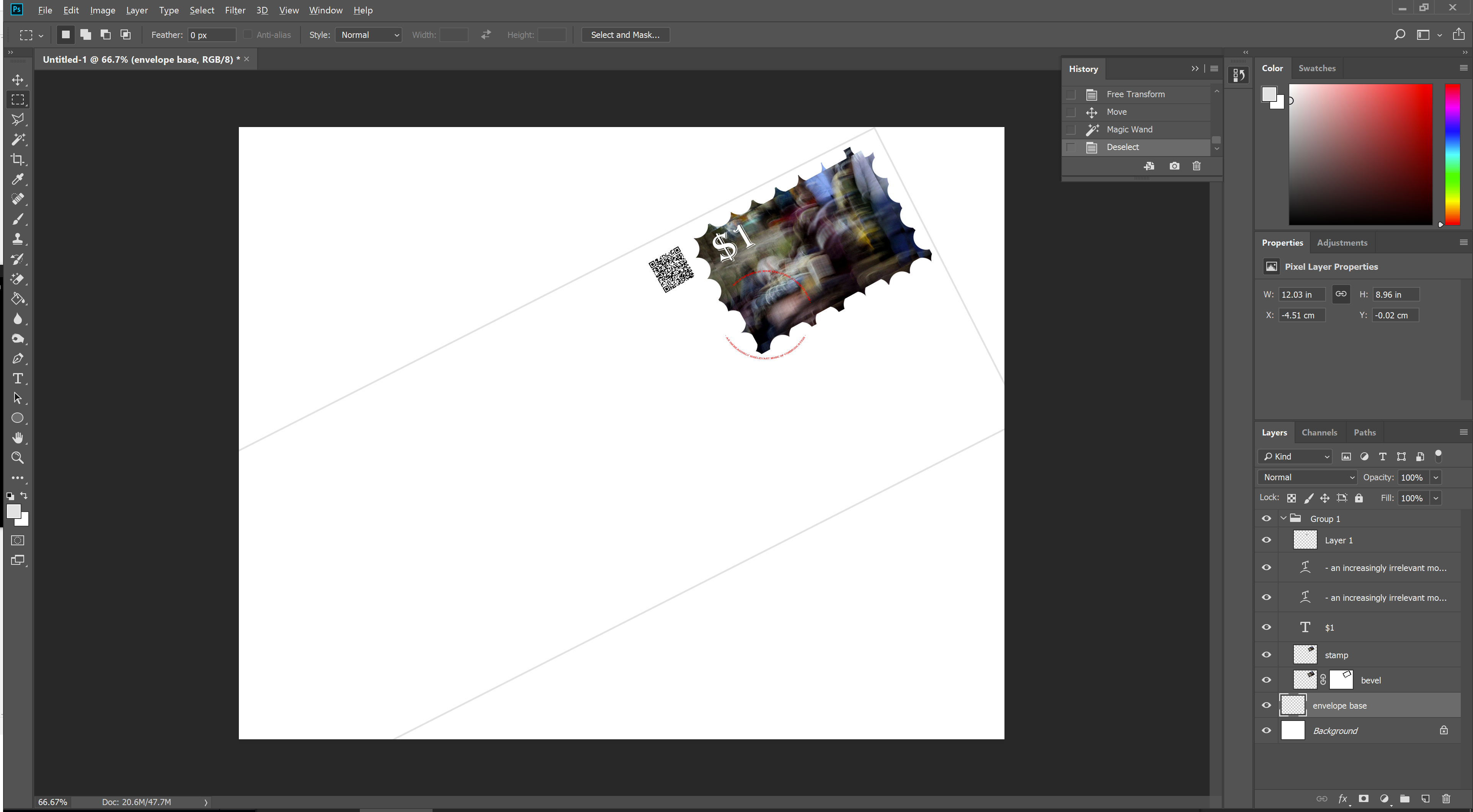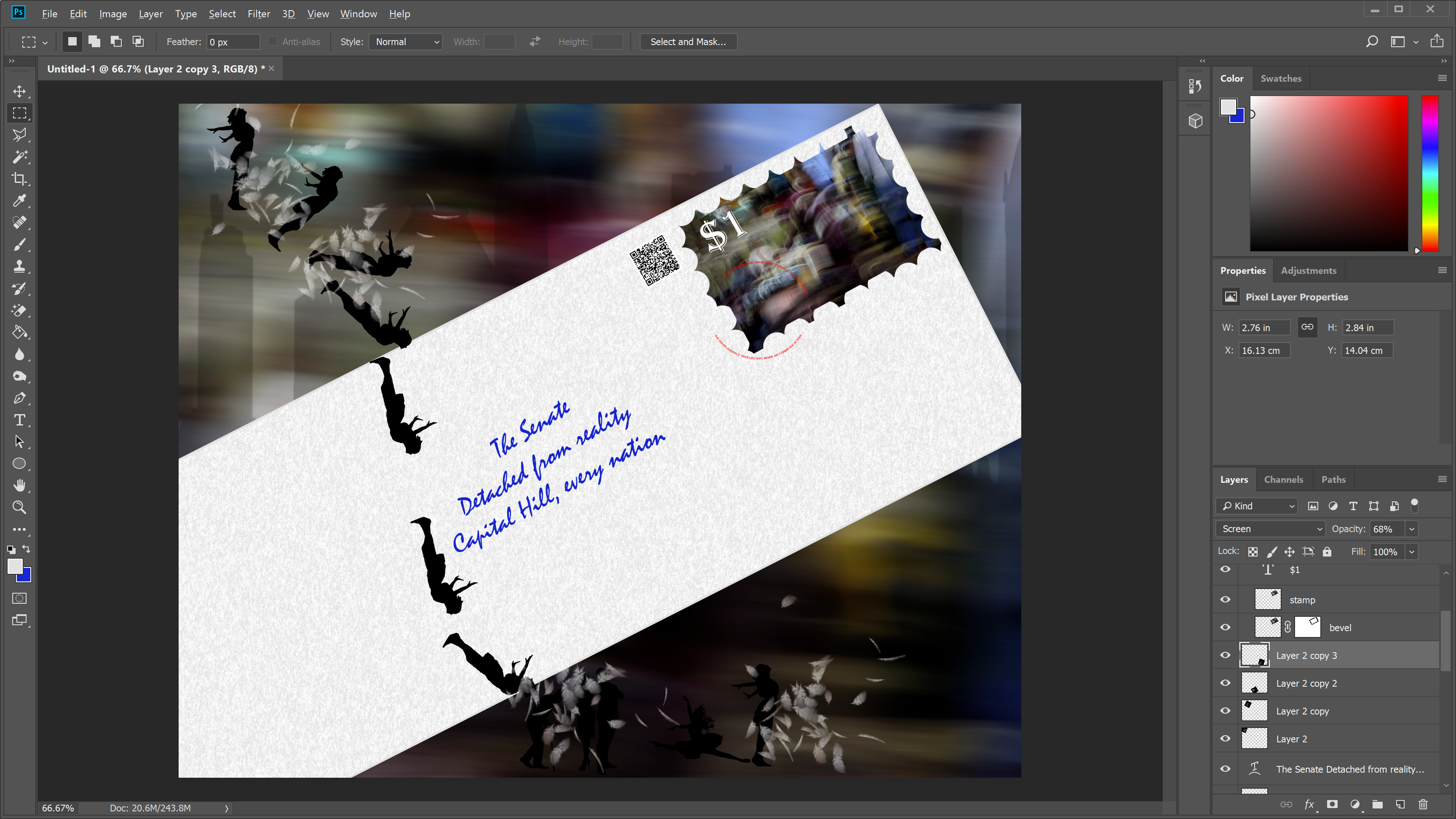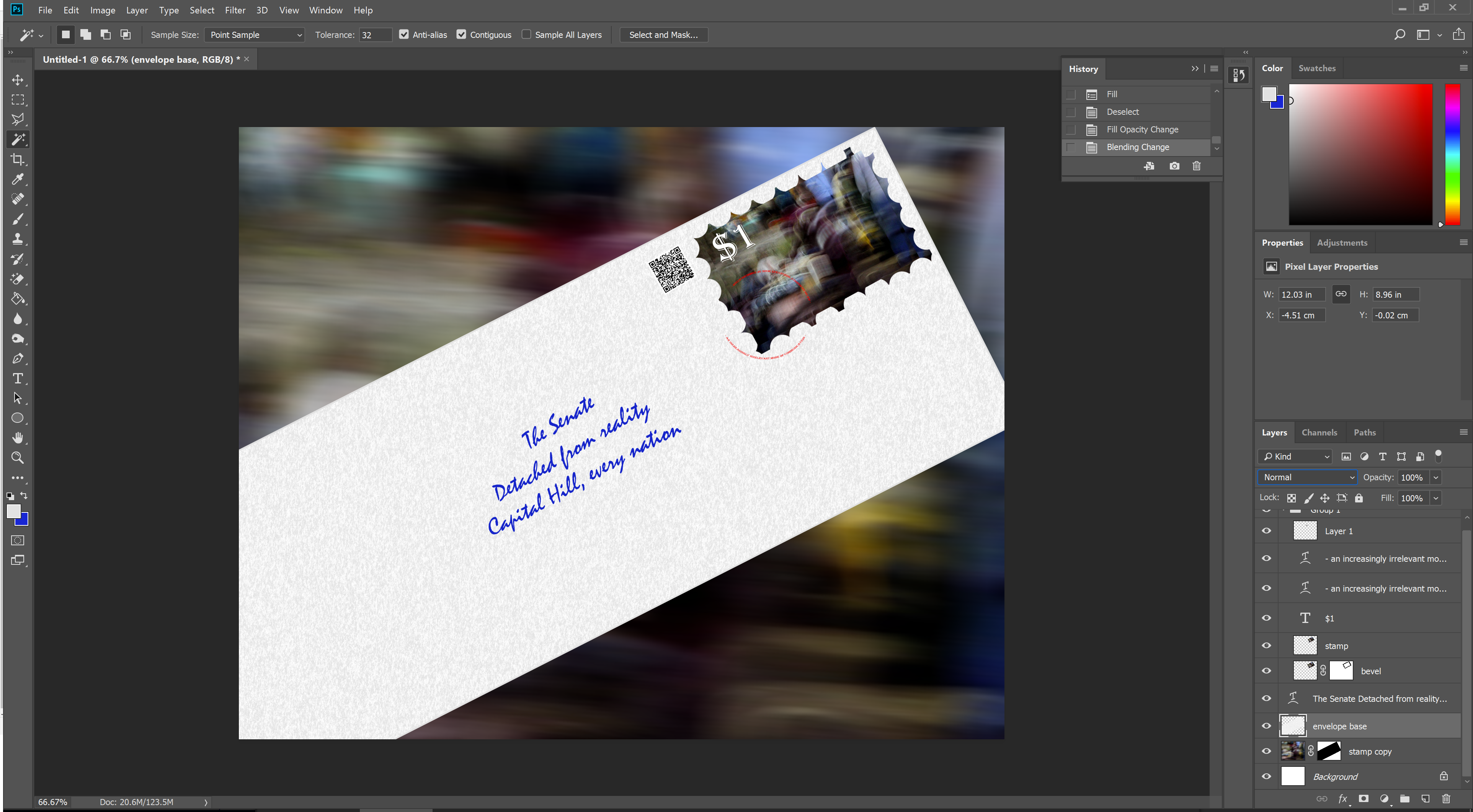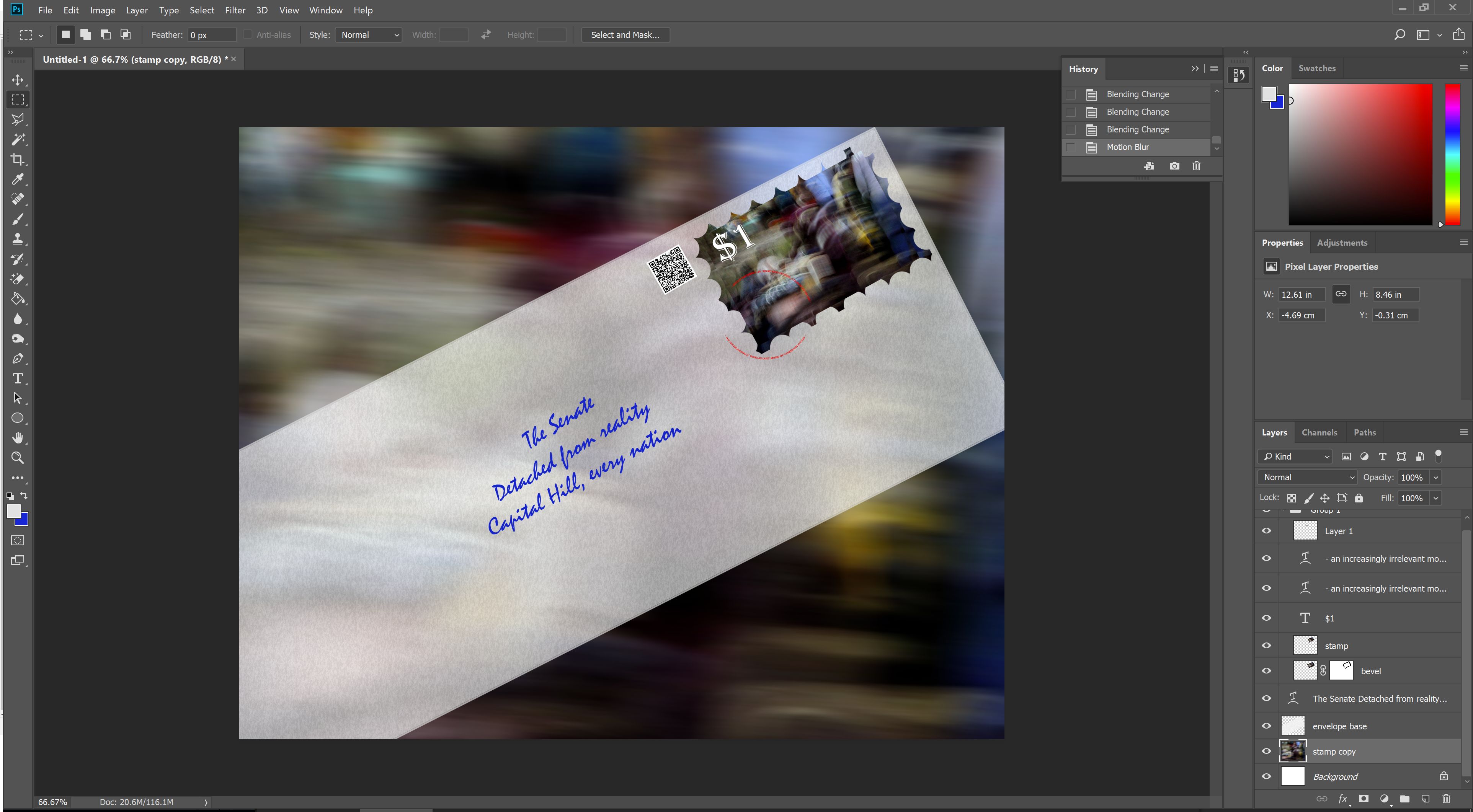 <a href="http://ivory-tower.net.au/img/collabart/TakeAction.jpg"><img src="http://ivory-tower.net.au/img/collabart/TakeAction.jpg" /></a><br/> <em>Click image for full res version!</em> This is my contribution to @everlove's collaborative art making exercise. This is the first time in a long time I've pulled out Photoshop and attempted anything creative in quite some time. Please find below my process for the creation of this image.  With the theme being take action, I figured using the provided image as a stamp, with a letter to the detached parliments of the world from their people's needs being a great starting point for an image.  Here I've progressed, using the original image to create a background. The letter / paper is slightly transluscent to get the papery texture implemented (created by render -> fibre). The QR code was generated online and the "postage stamp" was generated by typing text and distorting it in Photoshop. If you zoom in really close, you can read them both. ;)  I also didn't like the transperancy, so I removed it, by adding a layer mask on the bottom layer, allowing the white background to passthrough. At this stage, I feel as though the image looks far too manufactured, in particular, the envelope. It looks like something that you would see behind a news presenter. This isn't the normal style of work that I tend to produce. There's no evidence of what needs to change, or what action needs to be taken on what issue, because we live in a time where everything is an issue, no matter how irrelevant or important it is. Lobbyists, interested parties, corporations, and other groups want to try and influence the governments of the world through whatever means. Be this through stifling innovation, or not adopting a certain way of doing things; or stating that we should take x from z; there is a lack of foresight and planning from the governments of the worlds to secure the future of the their citizens in a global village. <h2>I am rambling about politics. I know nothing about politics. I don't care about politics.</h2> I just think it is a futile thing, not agile enough, be it democracy, aristocracy, or a dictatorship, no form of government is agile enough and flexible enough to nurture, progress and adapt to the increasingly rapid proliferation of technology and ideas. <h2>Rant over, back to the art making.</h2> We never know truly who anyone is, even after we've met them, even after we've spent time with them. Even after we've seen them angry, seen them sad, seen them happy. Shadows are the ultimate form of anonymity; and personify enigma. Not joy, like those shitty iphone / ipod ads used to do back in the day. https://steemitimages.com/DQmdquCHSdhNXC8au5yF1AdtcmPDiQjWYfVeeGrbCN7Jaks/image.png Still not my normal style of work - but thematically, message wise, I'm getting there. We need to take action before the cycle gets worse. The silhouettes are bought in, royalty free, from pixabay. One of my favourite pieces of software is Particle Illusion. I've used it extensively in my photo and video work in the past. It lets you generate motion, and my favourite thing to do with it is just experiment. This time, I'm going with intent, to create some falling feathers to add a sense of innocence lost to this image.  There's literally thousands of emitter libraries, and you can change the physical properties and variables for everything. It's time to dig in and see if I can find the feather emitters. <h2>Found them!</h2>  This is then used as an overlay, adding to about the thirty layers I already have, increasing the sense of movement throughout the image.  I feel at this stage, the work is finally complete. http://ivory-tower.net.au/img/collabart/TakeAction.jpg