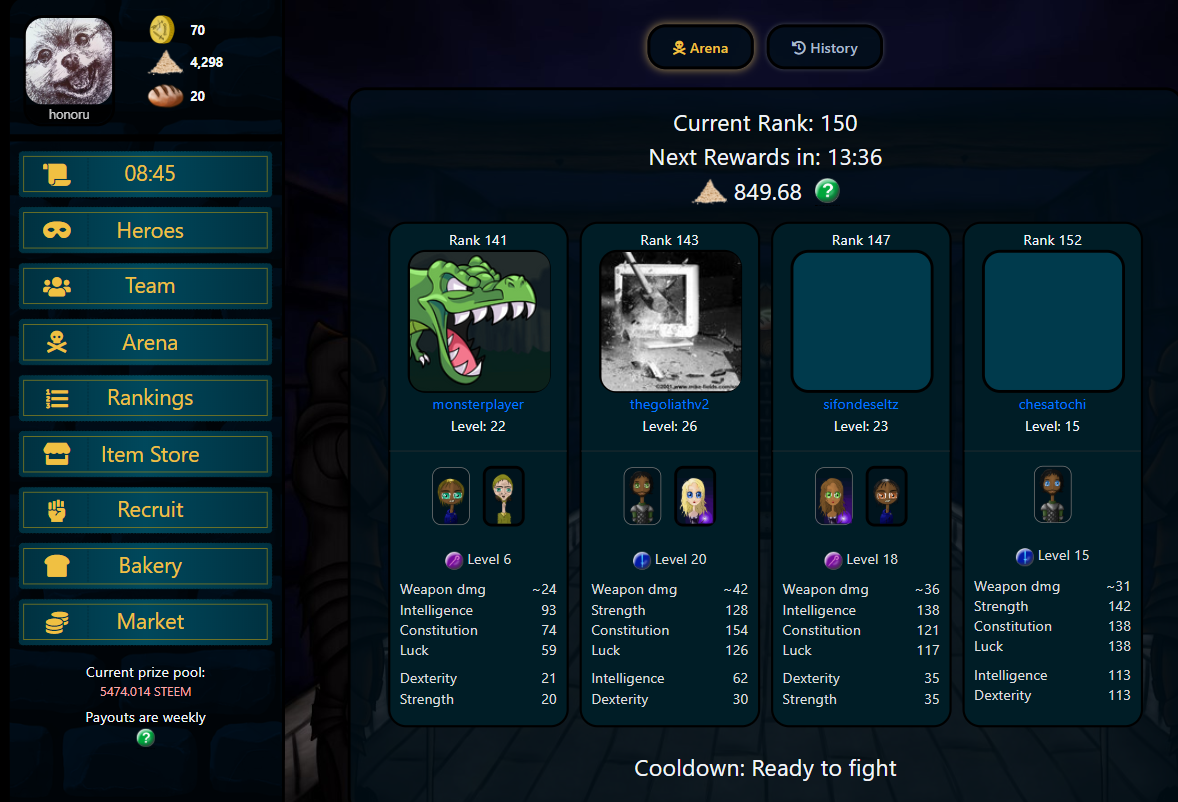 在Holy Bread (Steem新遊戲) 上,因為製作團隊會從 Steem-Engine上買入麵包屑。而賺麵包屑最快的方法是在排名戰上每15分鐘送出去。故此加入後便不段打排名戰,最高至80名。因為加入得比較遲,頂部的已打不過,要再升更高等級後,看看是否再買更強武器才能打上去。 可是,慢慢發現,有一些數據比我差,我卻打輸????  原來,打輸的原因是武器的耗捐比較大。   每打一次排名戰,武器便捐耗一點。捐耗了的武器可以修復,但金額也不少。至此之後,便少打了排名戰,另外也正值現時麵包屑的價格下跌。打少一點,養精蓄脫更好。 現時排在150名,理論上可以排在100-120名之間,不過,暫時不適宜打太多場排名賽,先集中升級。  另外,改變了分配升級點數的策略後,加強了另外兩類兵種的技能值 (智力及體質),在防範其他人的攻擊上,開始見到成效。