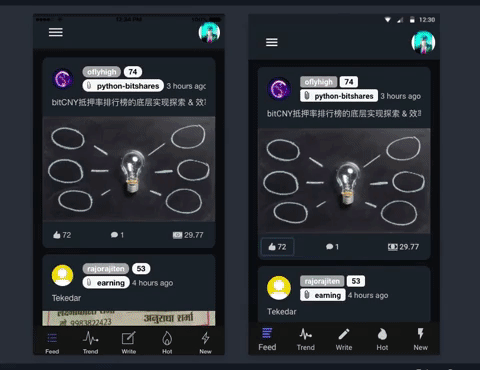 Hello everyone, I'm developing a mobile app for Steemit and I keep adding new features.  In the <a href="https://utopian.io/utopian-io/@hsynterkr/isteem-steemit-mobile-app">first version</a>, it only showed feeds. In the <a href="https://utopian.io/utopian-io/@hsynterkr/isteem-mobile-app-update">second version</a> you can see trend, hot, new content. But only a certain number of posts were listed. I solved this problem in this version. I also added very nice features for loading new posts. In this version I used infinite scroll to load new posts. Infinite Scroll is a nice feature that automatically adds the next page, saving users from a full page load. You’ve likely seen it in use all over the web. You can understand better by looking at the following gif.  Now I think you understand better. Now you can see all the feed posts. It also saves data and memory because it loads only 10 posts at first and adds 10 posts each time with an infinite scroll. The application has also become more performant with infinite scroll. I've added another feature that we've come across in every mobile app, except Infinite scroll. Pull to refresh... I leave a gif below again for a better understanding  I also created a sidebar and added profile and background components to the sidebar. You can go to the Github project <a href="https://github.com/hsynterkr/iSteem">here</a> and my pull request <a href="https://github.com/hsynterkr/iSteem/pull/2">here</a>. <br /><hr/><em>Posted on <a href="https://utopian.io/utopian-io/@hsynterkr/isteem-mobile-app-new-update">Utopian.io - Rewarding Open Source Contributors</a></em><hr/>