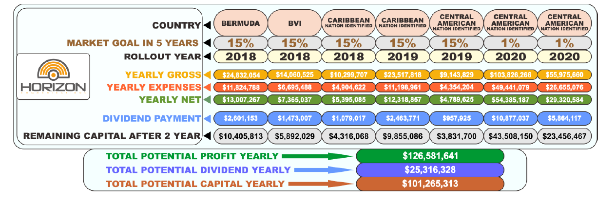 Прибыль от бизнеса на Бермудских островах. Привлекая только 15% рынка жилья и малого бизнеса, в течение нескольких лет в рамках нашего первоначального запуска Horizon планирует собрать валовую прибыль в размере 43,7 млн. Долл. США, при этом валовые расходы в размере 26,2 млн. Долл. США оставят совокупный чистый доход примерно 17,5 млн. долл. США за этот период.