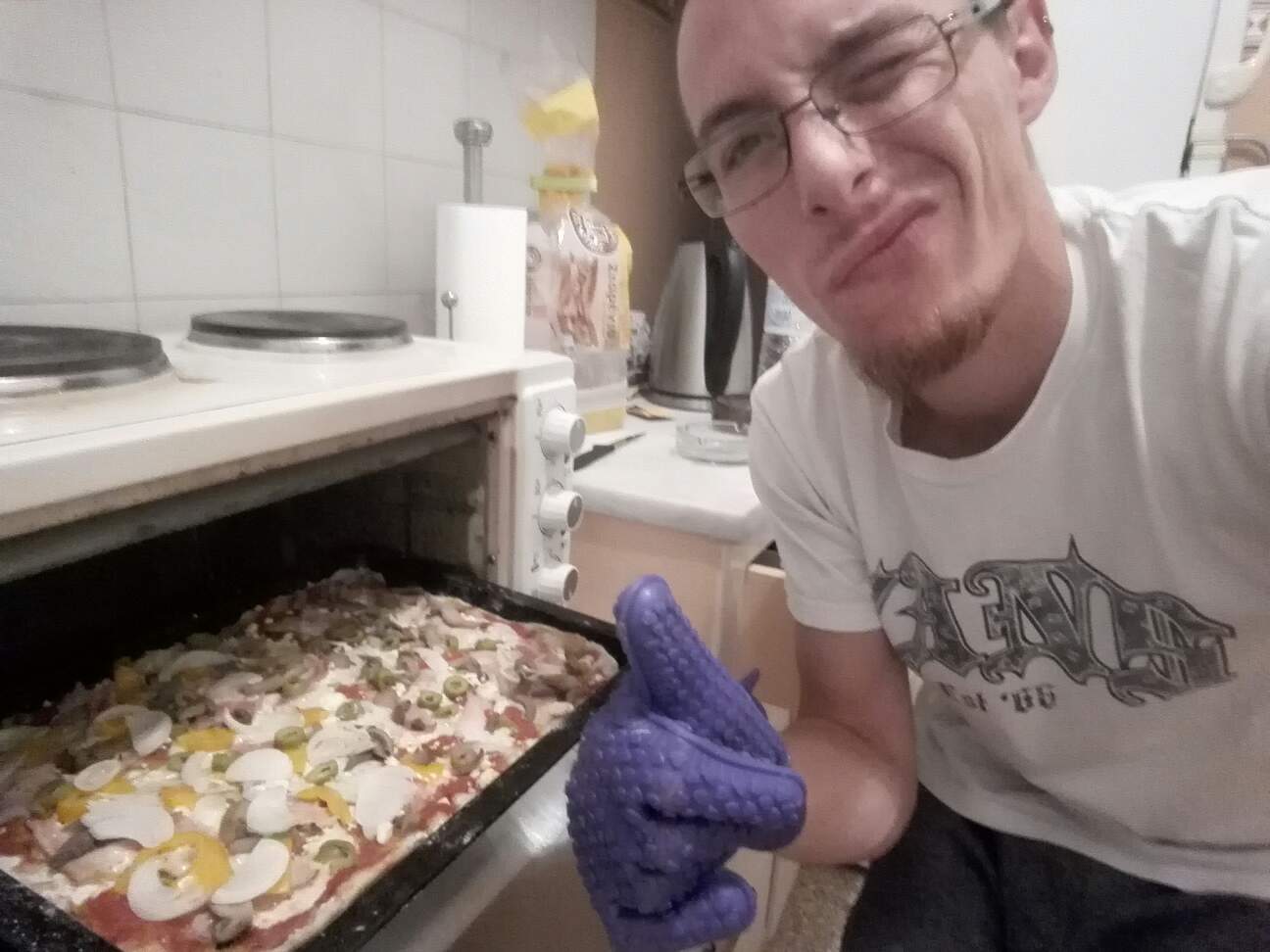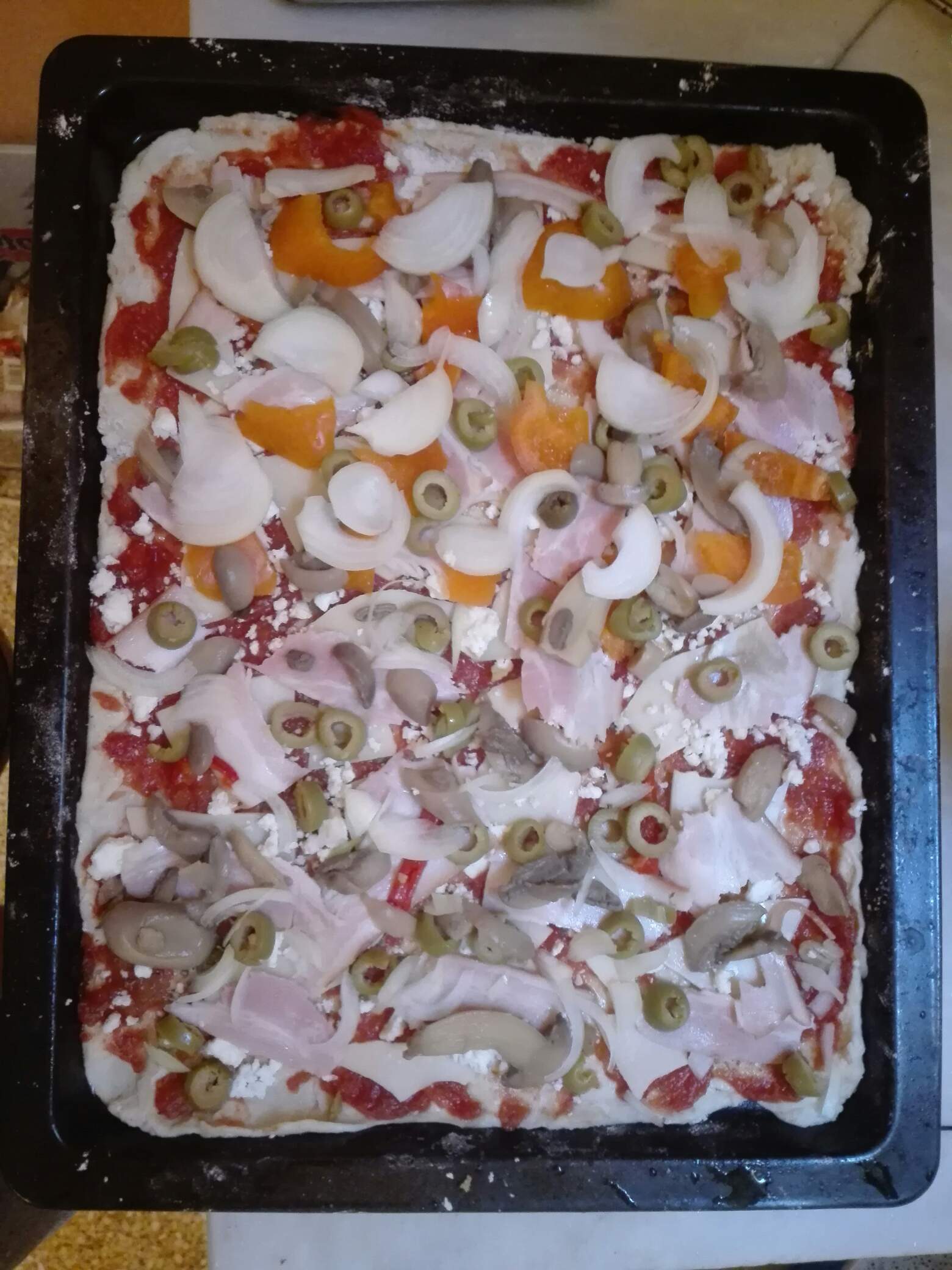 Yooo! <h2>It's pizza time</h2> ๐ช If you ask my girlfriend what's my favourite food she will answer pizza without even thinking about it. Since I moved in with @illusivelf I've been cooking us pizza at least 2 times a week. I didn't even know how to make dough at first but now look at me creating a colorful homemade pizza in no time. **Here is our lunch**  The left side is mine and the right side is for @illusivelf. My lady doesn't like pepper so I split the tray in two different parts. She also does not want a ton of ingredients, she prefer her slices light. Gotta keep my girl happy and full ๐ **Ingredients** - tomato sauce - gouda cheese - bacon - orange peppers - onion - garlic - Feta cheese - mushrooms - olives - oregano - salt **Before baking**  **After baking**  I am good to go Bon appetite ๐๐ป๐  Posted using [Partiko Android](https://partiko.app/referral/knowhow92)