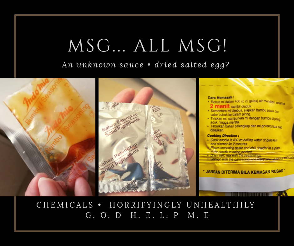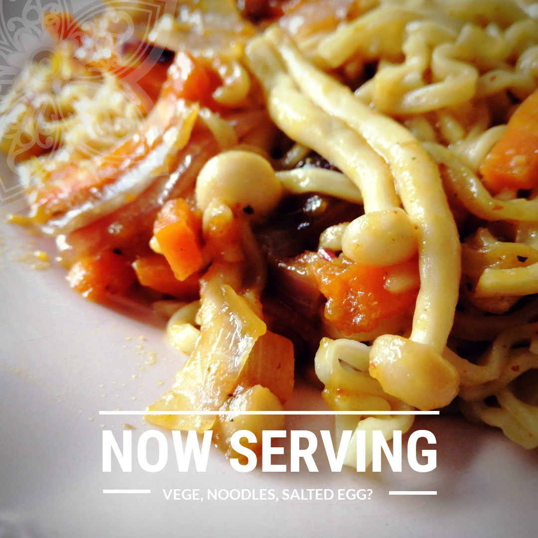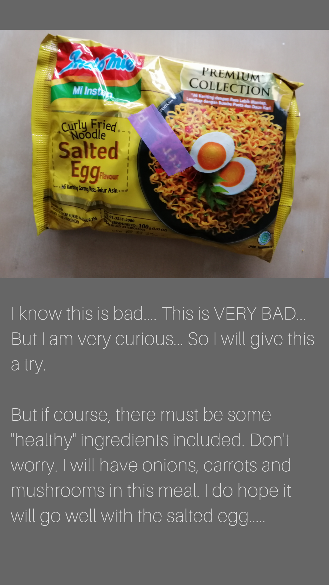 Today is an extremely horrible cheat day for me.  Hahaha... And health activists and vegans would have cringed to see this post. These days even with cheat days I try to stay on the fresh food cooking as much as I can recently, but today I saw something at _Village Grocer_ that stroke my curiosity.  Indomee was once (and actually still is) most Malaysians ultimate quick fix meal, especially for students I remembered during my uni days Malaysians who flew across the seas would bring at least one box of Indomee with them (or Maggie Mee for some and Cintan Mee for others) especially freshmen. This was their _survival food_ until they accustomed to the local food or figured out how to cook something better than instant noodles. Most poorer students would have even asked family to send over or any other countrymen they know who so happened to be travelling over to bring along too, as it was still a lot cheaper than buying instant noodles in their studying country, even though some countries do restrict their "imported items" Come to think of it, adult Malaysians still do that when they first travel abroad to unknown countries too.. Yes, @aaronleang, @joannewong and @elizacheng? 😆 But for this test product... ### Yes... I do have some fresh produce to go along with it.  The disadvantage of only have one stove is that you have to do things sequentially, and so while the noodles were boiling I was getting these ready to be sautéd with butter and nothing else, since there are already MSG flavouring available. At least it gives a nice aroma to it with that extra flavour, and sauté with butter brings allows the vegetables (and fungus) to retain their flavour # then comes the flavourings...  So apparently I have this salty red pack, some "dried salted egg yolk powder" and "chili powder in the aluminium pack with instructions on how to prepare the meal. After the vegetables were sautéd I added the ingredients and mix them up before adding the drained boiled instant noodles. # The taste Honestly there is no where close to an original salted egg paste flavour, but it could pass for first timers who has never tried salted egg yolk before. It isn't all bad and perhaps because I added fresh produce this has lowered the MSG effect that I feel less thirsty after the meal. _yes, most of the time you will feel extremely thirsty because of the MSG_ # Verdict? Honestly if I had other choices of instant noodles / ramen (like Korean samyang) I would have chose those. But it does have a kick of it and for those who are Indomee fans feel free to give it a go. The best part is that Village Grocer Atria actually sells on separate pack at about MYR 1.39, and I find this good because they kill two birds with one stone: satisfy customers' curiosity and at the same time they earn more by selling it separately. ## How about you? Would you be curious enough to try this out? ## Have you encountered other slated egg instant noodles in the market and is worth recommending to try ? If you have tried others before do share your experience at the comment below!  To end this post in case that there is a #cookwithus reference, I have my handle here. Yes. I cooked it, and I ate it. Haha I hope you have enjoyed reading this review as much as I have enjoyed preparing it. # Until Then Posted using [Partiko Android](https://steemit.com/@partiko-android)