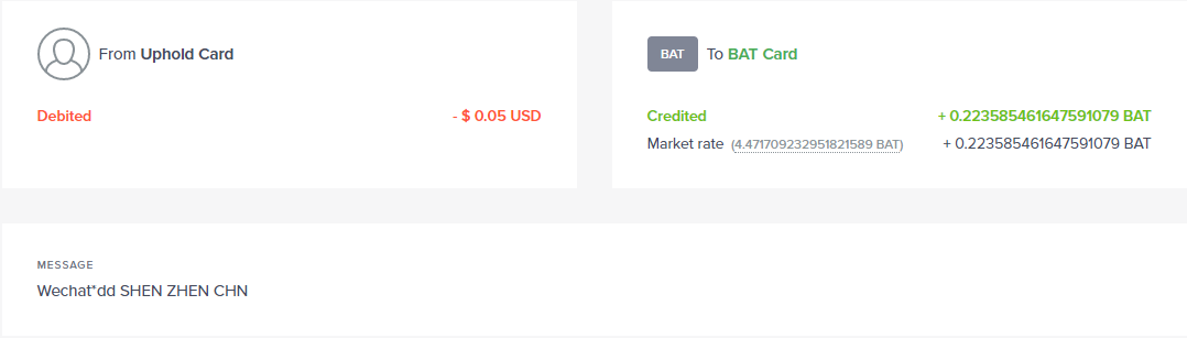 两个星期前,在[测试加密币银行卡绑定微信支付](https://steem.buzz/hive-180932/@lnakuma/2brn4v)中提到了***Uphold Card***的事情。在昨天晚上,收到了他们的实体卡。银行卡绑定也非常容易,只要将信封里面的Pin密码在手机*APP*上面填入就可以了。  由于刚刚过了5号***Brave Browser***发币的日子,又增加了一些**BAT**测试这张加密币银行卡。 上次用来测试绑定微信的金额退回来了。但是由于手续费和**BAT**价格的变化,支出和返回的数目有所不同。  *支出*  *回收* 试想如果在这阶段中,BAT降价了,收回的比支出的多该多好。当然假象这些没有用。可以看到,使用***Uphold Card***或者说***Uphold***收取1.95%的费。这个和在***Uphold***中交易不同的加密币的手续费是一样的。卡本身不收其它的费用。  五天后,还有一笔***Brave***的转介收入将要转进***Uphold***中,虽然不多,然是确确实实可以通过***Brave***浏览器赚得不少的超市买菜钱。 ------ 几天没上***STEEMIT***来,发现这里发生了不少的事情。现在离能够成为***steemauto***的跟踩族还差了*100SP*。看来这几天要抓紧机会多赚SP,100%Power Up。争取尽早加入到队伍中。到时候要做到双手***啪啪啪***,双脚***踩踩踩***。大家等着我。