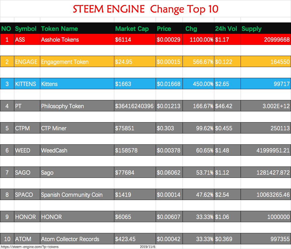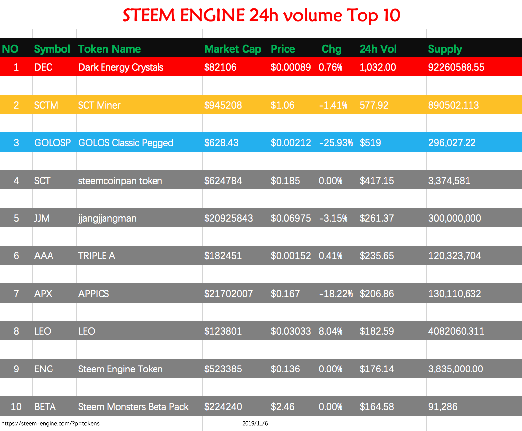 Welcome to daily Steem Engine Trading list, Data obtained from the Steem Engine. Steem Engine Trading list will be posted daily.If you like it, please support upvoting and follow me @m18207319997. Thank you very much. ๐ STEEM ENGINE 24h volume Top 10 NO Symbol Token Name Market Cap Price Chg 24h Vol Supply 1 DEC Dark Energy Crystals $82106 $0.00089 0.76% 1,032.00 92260588.55 2 SCTM SCT Miner $945208 $1.06 -1.41% 577.92 890502.113 3 GOLOSP GOLOS Classic Pegged $628.43 $0.00212 -25.93% $519 296,027.22 4 SCT steemcoinpan token $624784 $0.185 0.00% $417.15 3,374,581 5 JJM jjangjjangman $20925843 $0.06975 -3.15% $261.37 300,000,000 6 AAA TRIPLE A $182451 $0.00152 0.41% $235.65 120,323,704 7 APX APPICS $21702007 $0.167 -18.22% $206.86 130,110,632 8 LEO LEO $123801 $0.03033 8.04% $182.59 4082060.311 9 ENG Steem Engine Token $523385 $0.136 0.00% $176.14 3,835,000.00 10 BETA Steem Monsters Beta Pack $224240 $2.46 0.00% $164.58 91,286 https://steem-engine.com/?p=tokens 2019/11/6 STEEM ENGINE Change Top 10 NO Symbol Token Name Market Cap Price Chg 24h Vol Supply 1 ASS Asshole Tokens $6114 $0.00029 1100.00% $1.17 20999668 2 ENGAGE Engagement Token $24.95 $0.00015 566.67% $0.122 164550 3 KITTENS Kittens $1663 $0.01668 450.00% $2.65 99717 4 PT Philosophy Token $36416240396 $0.01213 166.67% $46.42 3.002E+12 5 CTPM CTP Miner $75851 $0.303 99.62% $0.455 250113 6 WEED WeedCash $158578 $0.00378 60.65% $1.48 41999951.21 7 SAGO Sago $77684 $0.06062 53.71% $1.12 1281427.872 8 SPACO Spanish Community Coin $1419 $0.00014 47.62% $2.54 10063265.46 9 HONOR HONOR $6065 $0.00607 33.33% $1.06 1000000 10 ATOM Atom Collector Records $423.45 $0.00042 33.33% $0.369 997355 https://steem-engine.com/?p=tokens 2019/11/6 STEEM ENGINE Price Top 10 NO Symbol Token Name Market Cap Price Chg 24h Vol Supply 1 ALLAH ALLAH 136470 15163 0 -- 9 2 YHWH YHWH 30327.00 15163.00 0.00% -- 2 3 BTCP BITCOIN Pegged 11892.00 9098.00 0.00% $78 1.31 4 NOGANOO Noganoo Tokens 7581663066.00 758.17 0.00% -- 10,000,001 5 LOVE JANASILVER 1137249.00 758.17 0.00% -- 1,500 6 QTL Quatloo 8340.00 758.17 0.00% -- 11 7 STEEMSENSE STEEMSENSE 303266.00 303.27 0.00% -- 1,000 8 BCHP BITCOIN CASH Pegged 917.40 237.31 0.00% -- 3.866 9 TROPHY JJM Trophy 758.17 151.63 0.00% -- 5.00 10 NEOXAGM Neoxian Silver Miner 22003.00 151.48 0.00% $0.15 145 https://steem-engine.com/?p=tokens 2019/11/6
