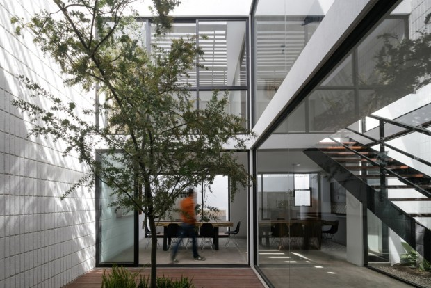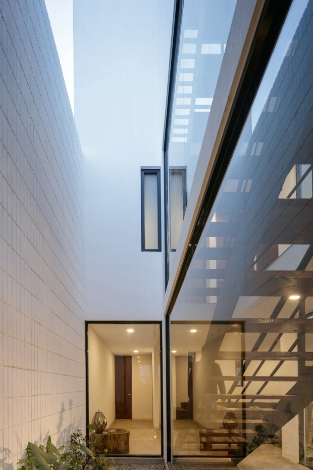 Mexican architectural firms Espacio 18 and Cueto have taken advantage of abandoned land in Puebla, Mexico, to design a monolithic contemporary home, but in which they have incorporated a bright interior courtyard and rooftop patio. . The house is home to 249 m2, spread over three floors, with a main living room on the ground floor, three bedrooms upstairs and the roof terrace. Casa Once was designed to suit a young couple looking for a shelter that would take them away from the chaos and create a space of tranquility. The house has a rectangular floor plan, taking all the building area. To create outdoor spaces, the top floor has a patio overlooking the city, while a protected courtyard on the ground floor introduces greenery into the interior. The house is located in a single-family complex in the city of Puebla. Upon entering, there is a living room, a dining room and a kitchen, a black metal staircase leads upstairs with a wooden floor. An acacia is planted in the center of the inner courtyard and becomes bright purple in the spring, adding a touch of color to the sleek interior. The interior garden features a patio with double-height glazed walls and a textured, white-painted surface. The top floor of Casa Once offers more space for entertainment, with a multimedia room and an outdoor patio that offers panoramic views of the city and its volcanoes. Nature and cross ventilation play an important role in the design of the house, in keeping with the warm and temperate climate of the region. The exterior of the house is covered with natural wood and black stucco, with minimal windows overlooking the street to create intimacy, as well as to control daytime heat.