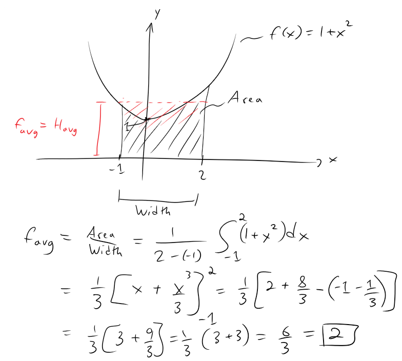 https://youtu.be/Ps1IPP4O_Lo In this video I go over an example on solving for the average value of a function and solve the average value of the function y = 1 + x<sup>2</sup> from x = - 1 and x = 2. --- Watch Video On: - DTube: [https://d.tube/#!/v/mes/9fl8o0x2sv5](https://d.tube/#!/v/mes/9fl8o0x2sv5) - BitChute: [https://www.bitchute.com/video/wU0x5sed9mdy/](https://www.bitchute.com/video/wU0x5sed9mdy/) - YouTube: [https://youtu.be/Ps1IPP4O_Lo](https://youtu.be/Ps1IPP4O_Lo) Download Video Notes: http://1drv.ms/1BSQsf3 --- # View Video Notes Below! --- >Download These Notes: Link is in Video Description. >View These Notes as an Article: https://steemit.com/@mes >Subscribe via Email: http://mes.fm/subscribe >Donate! :) https://mes.fm/donate > >Reuse of My Videos: >- Feel free to make use of / re-upload / monetize my videos as long as you provide a link to the original video. > >Fight Back Against Censorship: >- Bookmark sites/channels/accounts and check periodically >- Remember to always archive website pages in case they get deleted/changed. > >Join my private Discord Chat Room: https://mes.fm/chatroom > >Check out my Reddit and Voat Math Forums: >- Reddit: https://reddit.com/r/AMAZINGMathStuff >- Voat: https://voat.co/v/AMAZINGMathStuff > >Buy "Where Did The Towers Go?" by Dr. Judy Wood: https://mes.fm/judywoodbook >Follow along my epic video series: >- #MESScience: https://mes.fm/science-playlist >- #MESExperiments: https://steemit.com/mesexperiments/@mes/list >- #AntiGravity: https://steemit.com/antigravity/@mes/series >-- See Part 6 for my Self Appointed PhD and #MESDuality Breakthrough Concept! >- #FreeEnergy: https://mes.fm/freeenergy-playlist > >--- > >NOTE #1: If you don't have time to watch this whole video: > >- Skip to the end for Summary and Conclusions (If Available) >- Play this video at a faster speed. >-- TOP SECRET LIFE HACK: Your brain gets used to faster speed. (#Try2xSpeed) >-- Try 4X+ Speed by Browser Extensions or Modifying Source Code. >-- **Browser Extension Recommendation: https://mes.fm/videospeed-extension** >-- See my tutorial to learn more: https://steemit.com/video/@mes/play-videos-at-faster-or-slower-speeds-on-any-website >- Download and Read Notes. >- Read notes on Steemit #GetOnSteem >- Watch the video in parts. > >NOTE #2: If video volume is too low at any part of the video: > >- Download this Browser Extension Recommendation: https://mes.fm/volume-extension --- # Integrals and Average Value: Example 1  **Example:** Find the average value of the function f(x) = 1 + x<sup>2</sup> on the interval [-1, 2]. **Solution:**