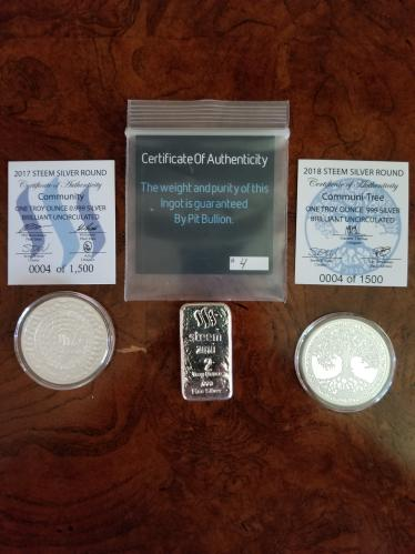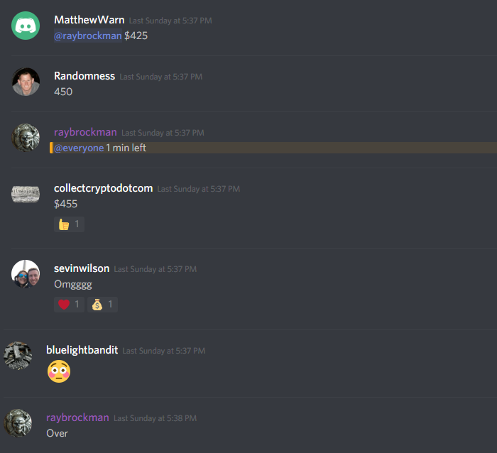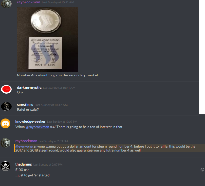<center></center> So we all left the Discord Channel on Sunday figuring SOMEONE out there would post about the amazing auction that we saw play out live that afternoon in SteemSilverGold community chat. But then no one did, and I was struggling to come up with a post topic for today after failing to post at all yesterday, so I figured I could rummage back through the chat and pull something together. The image above is the final moments of the auction. After the "OVER" call was made by @raybrockman a late bid of $465 was attempted, but it was too late. @thedamus made a late bid of "one meelllion dollars" which I felt should have counted, but I guess I was alone in that sentiment. So how did it all begin on an otherwise lazy Sunday afternoon? <center></center> Pardon my screen grabs, they are not works of art, but you can get the drift. At 10:41am Sunday morning (Central Time) @raybrockman posts a picture of 2017 STEEM Round #4 with the subtitle "Number 4 is about to go on the secondary market". Cut to a few hours later as people questioned Ray's intent and bluntly his sanity, and he follow up with: >@everyone anyone wanna put up a dollar amount for steem round number 4, before I put it to raffle, this would be the 2017 and 2018 steem round, would also guarantee you any futre number 4 as well. So it isn't just the 2017 round he is offering, it is a matched set of 2017 and 2018 Steem Silver Rounds. @thedamus gets things started with a $100 bid. It quickly goes to $175 from @collectcryptodotcom, at which point @thedamus (who holds round #5) decided to drop out. But things were just getting started. <center></center> @randomness jumps in at $225, at which point Ray sweetens the deal. That's the @pit-bullion 2oz Steem Poured bar #4. We're now up to 4oz of silver, and a $225 bid. By shortly after 4:00 the bidding was sitting at $300, and at 4:37 Ray declared there was to be one more hour before he closed the bidding and declared a winner. You can see at the top what happened at the end. $455 from @collectcryptodotcom comes in as the final bid before the auction closed, and we have a theoretical value of the low number rounds in the Steem Silver series. Let's get a close look at those winnings <center> </center> Final price ends up being over $100 per ounce, which is Juuuuussst a bit over spot. But it also comes with the right to purchase #4 of every Steem Silver Round moving forward. Each year the rounds are issued. A portion of the premium paid would be assumed to be the rights to that round number each year. If you would like to read back through the whole process of the auction, follow each bid as it was placed, and all the garbage (mostly from me) thrown in between (mostly about buying $po.et) just scroll back through the SteemSilverGold Discord Channel till you get to about 10:21am Sunday, July 8th, and you can read it all as it happened. So there you go. The Auction you probably never knew happened. These are the sort of things you get the fun of experiencing as a member of SteemSilverGold. There's always something new to discover with this group of wackadoos.