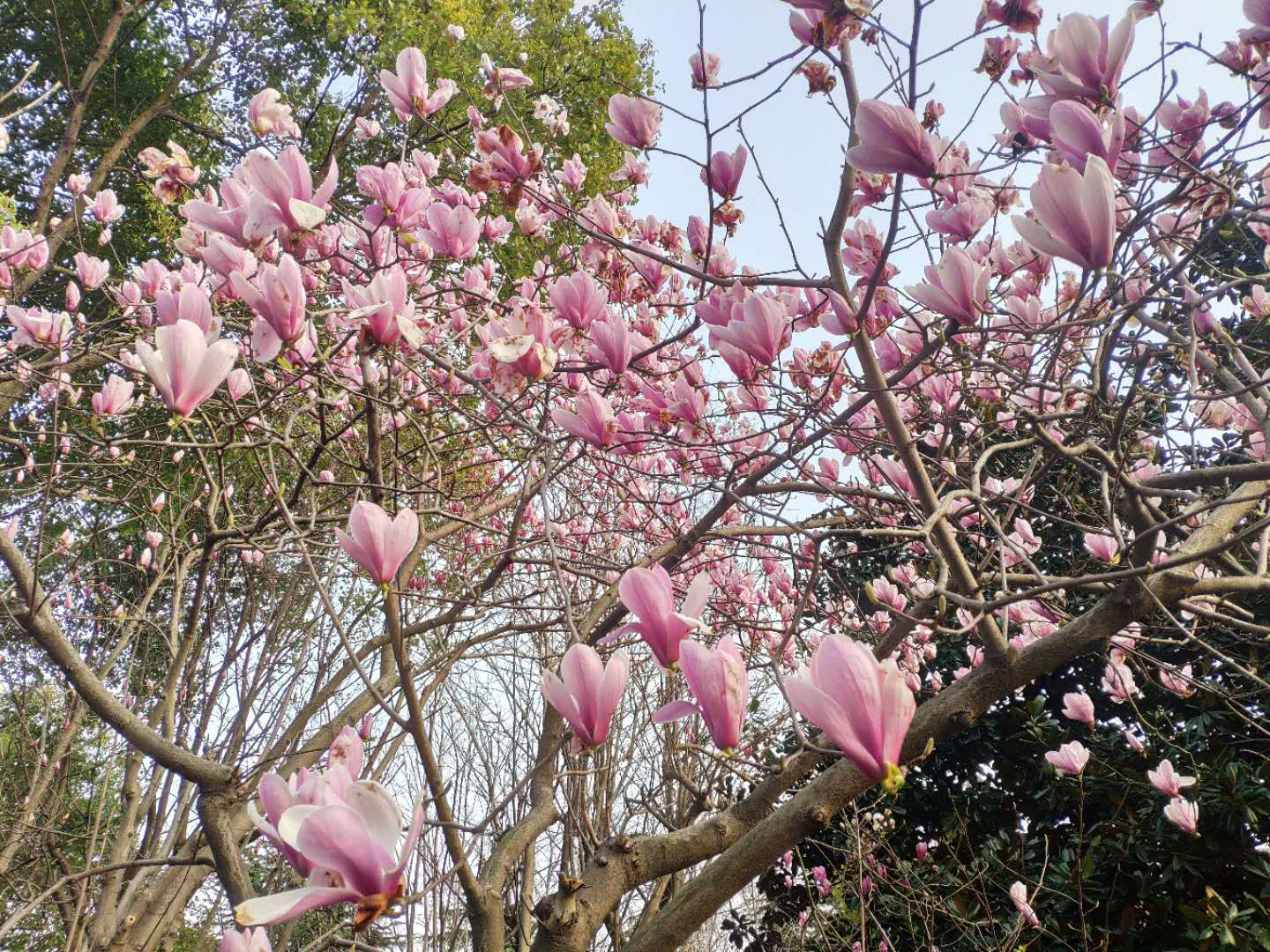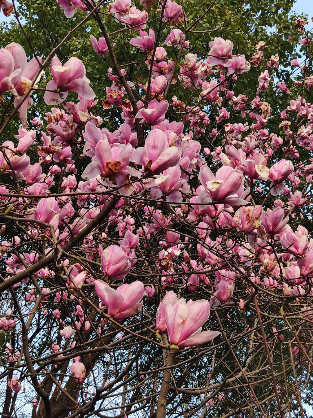 今天阳光明媚就出公园散步,看到一棵粉色玉兰花。为了找事写贴,当然下意识拿起手机就拍,但是玉兰花比较高,拍单朵还不好拍。拍整棵树也显得凌乱。于是就想办法找角度。开始的时候还找了朵稍微好一点的花作为前景拍了以下这种图:  这当然还差很多,转到另外一个角度,突然发现花长的方向都很整机,而且星罗棋布,这就给画面提供一定兴趣点。比起之前一张更有感觉一点,虽然也没多出色,我的水平就那样了。