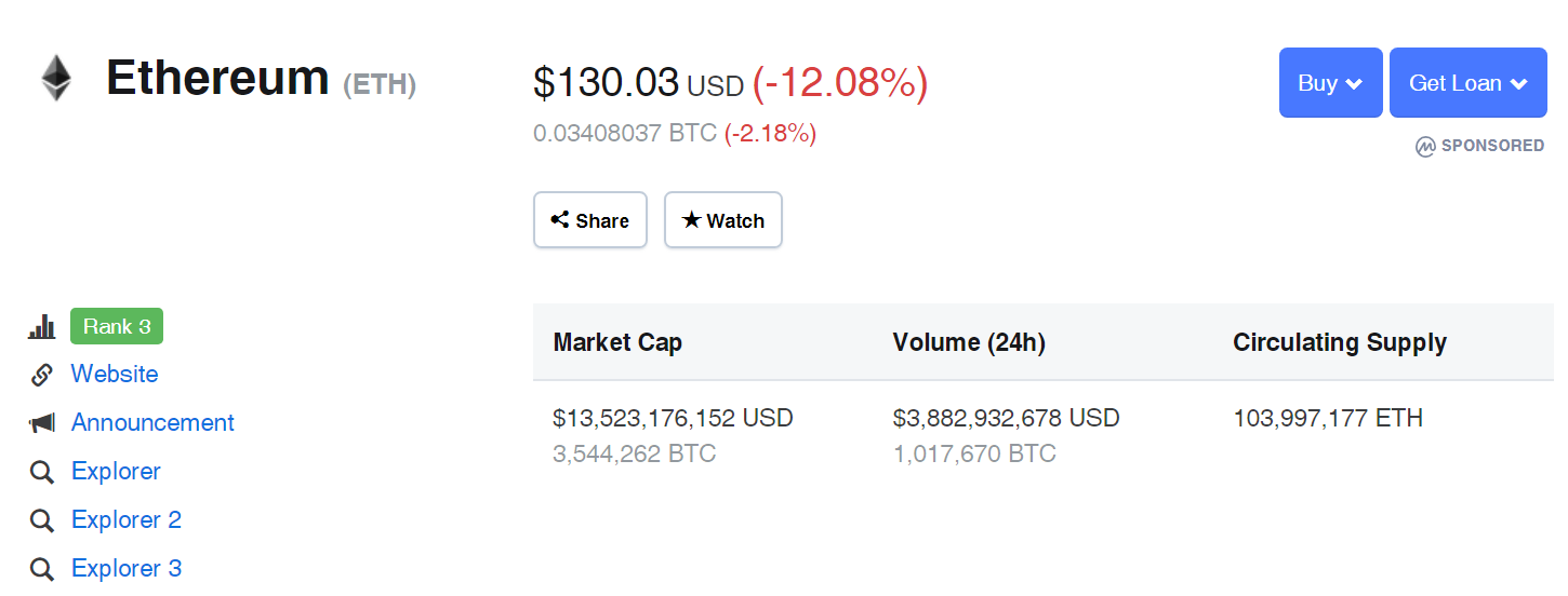 Ethereum (ETH)=$130.03 USD (-12.08%) =0.03408037 BTC (-2.18%)