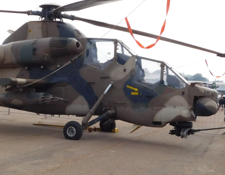 20mm cannon mounted on the front of a Rooivalk attack helicopter. -  Position where its mounted. -  Bullet tracks close up. -