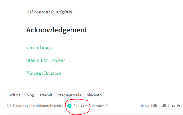 _Reporting my findings after one post. Have the bots helped?_ # As a scientist by education, I’m nothing if not interested in keeping records to determine the validity of anything. While it is likely to be far too early to determine conclusive results of my own performance, it’s always good to get in the rhythm of recording results. # # For those reading PART 2 before the original post, you’ll find that [HERE](). Go read that first and UPVOTE it. You’ve been told. # For the lazy, welcome to the succinct summary of PART 1: I want to increase my earnings and readership, and paying bots, might just be the way to do it. #  _You’ll see that I spent a total of $SBD 2.91 on voting bots. Trust the extreme math happening right before your eyes._ #  _Notice that the payout far exceeds what I have input so far._ # Be mindful that these values change and that the curator’s payout must also be deducted. I did three quick calculations of recent payouts and the _author payout_ ranged between 82% and 85% of the _total payout_. # Assuming I get a _conservative_ payout of 80% of $SBD 10.33, that’s $SBD 8.26 of which I must deduct the input of $SBD 2.91. This leaves me with net positive return of $SBD 5.35 of which 50% goes back to STEEM DOLLARS in my wallet after 7 days and 50% goes into STEEM POWER. # If all my balances were nil except for my initial $SBD 2.91 as STEEM DOLLARS, after 7 days, here’s what my account would look like: # STEEM POWER 4.13 STEEM STEEM DOLLARS $4.13 # I’ll keep on top of reporting my findings this week and look forward to the upcoming payouts! # All the best, Nick. # _All content is original._