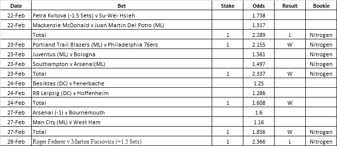 Not a lot of bets in February as i wasn't active till the end of the month. Was thinking of combining with the March bets but it's probably easier to get it out of the way. Small sample of bets so more important to see how March goes. | Month | Bets | Won | Lost | Push | Staked | Profit | ROI | |---------------|------|-----|------|------|--------|--------|-------| | February 2019 | 6 | 4 | 2 | 0 | 6 | 1.956 | 32.6% | ## The individual bets