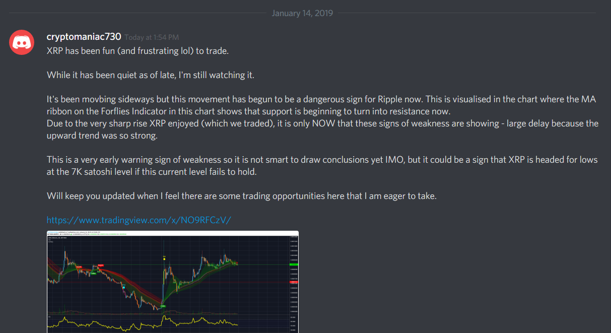 Ive opened a crypto signal group on discord which you can join to with this link : https://discord.gg/edQp2yR right now its free! so join now and tell your friends :) I want to post here my last forecast :  well , xrp didnt go went down yet but we will need to wait and see.