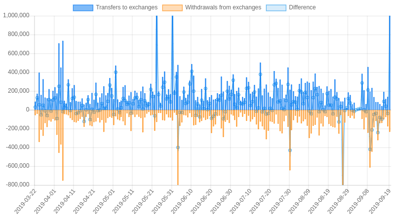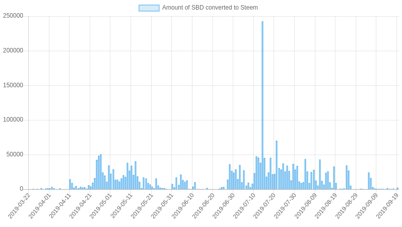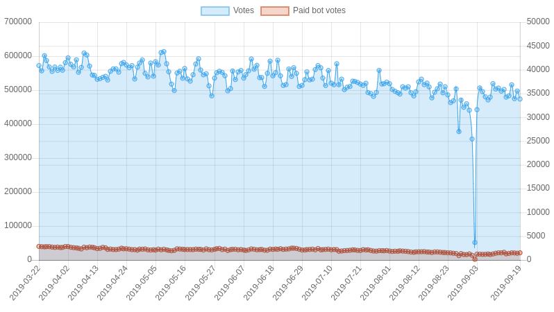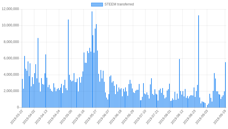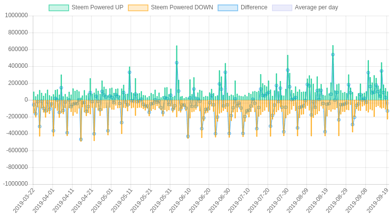Welcome to my Steem Stats Report for Friday, September 20, 2019. All data comes directly from the Steem blockchain and is based on UTC time. ## 1. Daily number of Posts (including comments)  Date | Posts --- | --- 2019-09-19 | 32,214 2019-09-18 | 33,765 2019-09-17 | 32,533 2019-09-16 | 33,037 2019-09-15 | 30,354 2019-09-14 | 29,503 2019-09-13 | 31,273 2019-09-12 | 33,045 <center>https://steemitimages.com/DQmbNxNgXLda5QXpWfDZxP2d3XR498RxCgucZVMnrBVcw7g/image.png</center> ## 2. Daily number of votes  Date | Votes | Paid bot votes | Percent bot votes --- | --- | --- | --- 2019-09-19 | 473,716 | 1,512 | 0.32% 2019-09-18 | 497,386 | 1,421 | 0.29% 2019-09-17 | 474,771 | 1,481 | 0.31% 2019-09-16 | 515,886 | 1,511 | 0.29% 2019-09-15 | 483,270 | 1,384 | 0.29% 2019-09-14 | 479,432 | 1,302 | 0.27% 2019-09-13 | 501,950 | 1,620 | 0.32% 2019-09-12 | 497,054 | 1,500 | 0.3% <center>https://steemitimages.com/DQmbNxNgXLda5QXpWfDZxP2d3XR498RxCgucZVMnrBVcw7g/image.png</center> ## 3. Daily accounts transacting  <sub>A 'transacting account' is a Steem account that made at least one transaction on the Steem blockchain. This can be a vote, post, comment, transfer, power up or sbd conversion. Users who only read from the Steem blockchain without interacting are not included. The actual number of 'Active users' is therefore much higher than the accounts transacting.</sub> Date | Accounts transacting --- | --- 2019-09-19 | 39,379 2019-09-18 | 38,537 2019-09-17 | 37,691 2019-09-16 | 39,866 2019-09-15 | 39,082 2019-09-14 | 38,956 2019-09-13 | 40,003 2019-09-12 | 40,264 <center>https://steemitimages.com/DQmbNxNgXLda5QXpWfDZxP2d3XR498RxCgucZVMnrBVcw7g/image.png</center> ## 4. Posts + Comments per post  Date | Average # comments | Posts --- | --- | --- 2019-09-19 | 2.49 | 9,234 2019-09-18 | 2.62 | 9,332 2019-09-17 | 2.53 | 9,211 2019-09-16 | 2.72 | 8,888 2019-09-15 | 2.79 | 8,016 2019-09-14 | 2.76 | 7,850 2019-09-13 | 2.75 | 8,350 2019-09-12 | 2.65 | 9,054 <center>https://steemitimages.com/DQmbNxNgXLda5QXpWfDZxP2d3XR498RxCgucZVMnrBVcw7g/image.png</center> ## 5. New accounts created  Date | New Accounts --- | --- 2019-09-19 | 349 2019-09-18 | 404 2019-09-17 | 363 2019-09-16 | 391 2019-09-15 | 347 2019-09-14 | 286 2019-09-13 | 331 2019-09-12 | 409 ## Who created the new accounts yesterday Account | Accounts created --- | --- [@steem](https://steemblockexplorer.com/@steem) | 254 [@oracle-d](https://steemblockexplorer.com/@oracle-d) | 13 [@imisstheoldkanye](https://steemblockexplorer.com/@imisstheoldkanye) | 12 [@partiko](https://steemblockexplorer.com/@partiko) | 9 [@blocktrades](https://steemblockexplorer.com/@blocktrades) | 9 [@steemhunt](https://steemblockexplorer.com/@steemhunt) | 9 [@fundition](https://steemblockexplorer.com/@fundition) | 6 [@steemmonsters](https://steemblockexplorer.com/@steemmonsters) | 5 [@steemwallet.born](https://steemblockexplorer.com/@steemwallet.born) | 5 <center>https://steemitimages.com/DQmbNxNgXLda5QXpWfDZxP2d3XR498RxCgucZVMnrBVcw7g/image.png</center> ## 6. Daily Amount of SBD converted to Steem  Date | Amount in SBD --- | --- 2019-09-19 | 2,291 SBD 2019-09-18 | 17 SBD 2019-09-17 | 824 SBD 2019-09-16 | 353 SBD 2019-09-15 | 480 SBD 2019-09-14 | 1,378 SBD 2019-09-13 | 242 SBD 2019-09-12 | 465 SBD <center>https://steemitimages.com/DQmbNxNgXLda5QXpWfDZxP2d3XR498RxCgucZVMnrBVcw7g/image.png</center> ## 7. Daily Amount of Steem Powered UP & DOWN  Date | Powered UP | Powered DOWN | Difference --- | --- | --- | --- 2019-09-19 | 100,247 STEEM | 230,779 STEEM | -130,532 STEEM 2019-09-18 | 140,932 STEEM | 113,245 STEEM | 27,687 STEEM 2019-09-17 | 182,166 STEEM | 94,335 STEEM | 87,831 STEEM 2019-09-16 | 446,298 STEEM | 102,284 STEEM | 344,014 STEEM 2019-09-15 | 133,192 STEEM | 89,361 STEEM | 43,831 STEEM 2019-09-14 | 169,191 STEEM | 70,958 STEEM | 98,233 STEEM 2019-09-13 | 260,538 STEEM | 83,503 STEEM | 177,035 STEEM 2019-09-12 | 292,978 STEEM | 200,169 STEEM | 92,809 STEEM Average p/d | 130,919 STEEM | 168,403 STEEM | -37,484 STEEM <center>https://steemitimages.com/DQmbNxNgXLda5QXpWfDZxP2d3XR498RxCgucZVMnrBVcw7g/image.png</center> ## Largest 'Power ups' yesterday Date & Time | From | To | STEEM --- | --- | --- | --- Sep 19, 14:31 | [@photoholic](https://steemblockexplorer.com/@photoholic) | [@photoholic](https://steemblockexplorer.com/@photoholic) | 40,000.000 Sep 19, 06:40 | [@superhardness](https://steemblockexplorer.com/@superhardness) | [@superhardness](https://steemblockexplorer.com/@superhardness) | 17,031.513 Sep 19, 14:07 | [@veronicalee](https://steemblockexplorer.com/@veronicalee) | [@veronicalee](https://steemblockexplorer.com/@veronicalee) | 5,038.086 Sep 19, 20:45 | [@nickyhavey](https://steemblockexplorer.com/@nickyhavey) | [@nickyhavey](https://steemblockexplorer.com/@nickyhavey) | 2,910.333 Sep 19, 18:55 | [@blocktrades](https://steemblockexplorer.com/@blocktrades) | [@jfoxsteempower](https://steemblockexplorer.com/@jfoxsteempower) | 2,539.765 Sep 19, 12:25 | [@ronaldoavelino](https://steemblockexplorer.com/@ronaldoavelino) | [@ronaldoavelino](https://steemblockexplorer.com/@ronaldoavelino) | 2,000.000 Sep 19, 15:39 | [@michealb](https://steemblockexplorer.com/@michealb) | [@michealb](https://steemblockexplorer.com/@michealb) | 2,000.000 Sep 19, 08:21 | [@blocktrades](https://steemblockexplorer.com/@blocktrades) | [@blaogao](https://steemblockexplorer.com/@blaogao) | 1,993.943 Sep 19, 15:17 | [@samstonehill](https://steemblockexplorer.com/@samstonehill) | [@samstonehill](https://steemblockexplorer.com/@samstonehill) | 1,277.312 Sep 19, 19:36 | [@xels](https://steemblockexplorer.com/@xels) | [@xels](https://steemblockexplorer.com/@xels) | 1,236.488 <center>https://steemitimages.com/DQmbNxNgXLda5QXpWfDZxP2d3XR498RxCgucZVMnrBVcw7g/image.png</center> ## 8. Daily Steem Transfers from and to exchanges  <sub>Transfers from one exchange to another are excluded.</sub> Date | Transfers to exchanges | Withdrawals from exchanges | Difference --- | --- | --- | --- 2019-09-19 | 1,330,714 STEEM | 235