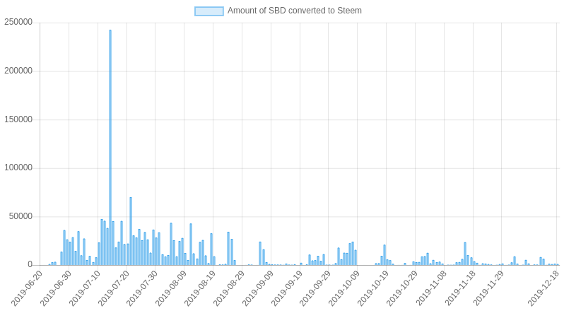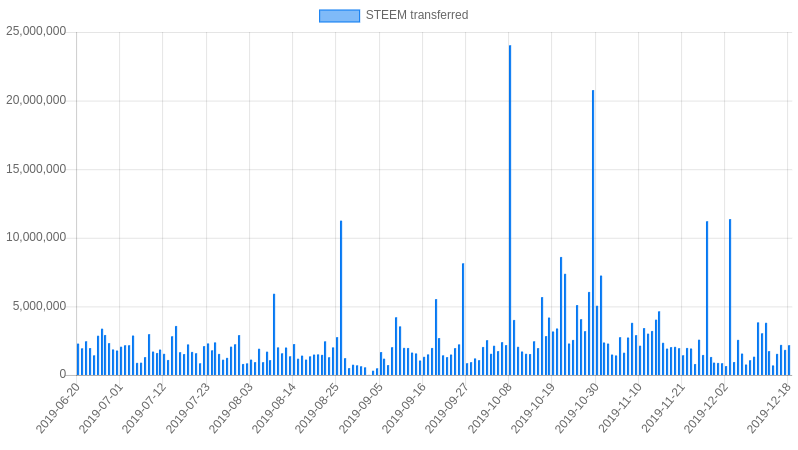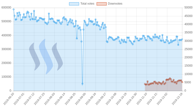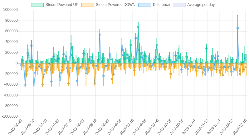 Welcome to my Steem Stats Report for Thursday, December 19, 2019. All data comes directly from the Steem blockchain and is based on UTC time. ## 1. Daily number of Posts (including comments)  Date | Posts --- | --- 2019-12-18 | 30,676 2019-12-17 | 29,380 2019-12-16 | 31,103 2019-12-15 | 29,167 2019-12-14 | 26,623 2019-12-13 | 28,913 2019-12-12 | 30,739 2019-12-11 | 30,400 <center>https://steemitimages.com/DQmbNxNgXLda5QXpWfDZxP2d3XR498RxCgucZVMnrBVcw7g/image.png</center> ## 2. Daily number of votes  Date | Total votes | Downvotes | Percent downvotes --- | --- | --- | --- 2019-12-18 | 372,515 | 5,288 | 1.42% 2019-12-17 | 366,297 | 6,323 | 1.73% 2019-12-16 | 368,550 | 6,156 | 1.67% 2019-12-15 | 366,883 | 6,274 | 1.71% 2019-12-14 | 331,785 | 6,029 | 1.82% 2019-12-13 | 391,383 | 5,604 | 1.43% 2019-12-12 | 392,905 | 4,398 | 1.12% 2019-12-11 | 368,278 | 5,406 | 1.47% <center>https://steemitimages.com/DQmbNxNgXLda5QXpWfDZxP2d3XR498RxCgucZVMnrBVcw7g/image.png</center> ## 3. Daily accounts transacting  <sub>A 'transacting account' is a Steem account that made at least one transaction on the Steem blockchain. This can be a vote, post, comment, transfer, power up or sbd conversion. Users who only read from the Steem blockchain without interacting are not included. The actual number of 'Active users' is therefore much higher than the accounts transacting.</sub> Date | Accounts transacting --- | --- 2019-12-18 | 32,109 2019-12-17 | 31,187 2019-12-16 | 30,928 2019-12-15 | 31,251 2019-12-14 | 30,142 2019-12-13 | 32,916 2019-12-12 | 32,391 2019-12-11 | 31,508 <center>https://steemitimages.com/DQmbNxNgXLda5QXpWfDZxP2d3XR498RxCgucZVMnrBVcw7g/image.png</center> ## 4. Posts + Comments per post  Date | Average # comments | Posts --- | --- | --- 2019-12-18 | 2.64 | 8,421 2019-12-17 | 2.39 | 8,670 2019-12-16 | 2.62 | 8,602 2019-12-15 | 2.50 | 8,327 2019-12-14 | 2.39 | 7,851 2019-12-13 | 2.52 | 8,223 2019-12-12 | 2.60 | 8,545 2019-12-11 | 2.64 | 8,344 <center>https://steemitimages.com/DQmbNxNgXLda5QXpWfDZxP2d3XR498RxCgucZVMnrBVcw7g/image.png</center> ## 5. New accounts created  Date | New Accounts --- | --- 2019-12-18 | 256 2019-12-17 | 277 2019-12-16 | 355 2019-12-15 | 202 2019-12-14 | 185 2019-12-13 | 263 2019-12-12 | 344 2019-12-11 | 380 ## Who created the new accounts yesterday Account | Accounts created --- | --- [@steem](https://steemblockexplorer.com/@steem) | 155 [@steemmonsters](https://steemblockexplorer.com/@steemmonsters) | 31 [@oracle-d](https://steemblockexplorer.com/@oracle-d) | 13 [@crypticat](https://steemblockexplorer.com/@crypticat) | 13 [@fundition](https://steemblockexplorer.com/@fundition) | 8 [@buzzi.app](https://steemblockexplorer.com/@buzzi.app) | 6 [@steemhunt](https://steemblockexplorer.com/@steemhunt) | 4 <center>https://steemitimages.com/DQmbNxNgXLda5QXpWfDZxP2d3XR498RxCgucZVMnrBVcw7g/image.png</center> ## 6. Daily Amount of SBD converted to Steem  Date | Amount in SBD --- | --- 2019-12-18 | 1,041 SBD 2019-12-17 | 1,295 SBD 2019-12-16 | 949 SBD 2019-12-15 | 1,238 SBD 2019-12-14 | 197 SBD 2019-12-13 | 6,400 SBD 2019-12-12 | 8,182 SBD 2019-12-11 | 523 SBD <center>https://steemitimages.com/DQmbNxNgXLda5QXpWfDZxP2d3XR498RxCgucZVMnrBVcw7g/image.png</center> ## 7. Daily Amount of Steem Powered UP & DOWN  Date | Powered UP | Powered DOWN | Difference --- | --- | --- | --- 2019-12-18 | 172,870 STEEM | 236,374 STEEM | -63,504 STEEM 2019-12-17 | 322,568 STEEM | 170,837 STEEM | 151,731 STEEM 2019-12-16 | 40,372 STEEM | 154,121 STEEM | -113,749 STEEM 2019-12-15 | 189,839 STEEM | 174,198 STEEM | 15,641 STEEM 2019-12-14 | 25,344 STEEM | 44,615 STEEM | -19,271 STEEM 2019-12-13 | 38,738 STEEM | 237,340 STEEM | -198,602 STEEM 2019-12-12 | 101,726 STEEM | 106,621 STEEM | -4,895 STEEM 2019-12-11 | 899,915 STEEM | 238,625 STEEM | 661,290 STEEM Average p/d | 153,801 STEEM | 157,855 STEEM | -4,055 STEEM <center>https://steemitimages.com/DQmbNxNgXLda5QXpWfDZxP2d3XR498RxCgucZVMnrBVcw7g/image.png</center> ## Largest 'Power ups' yesterday Date & Time | From | To | STEEM --- | --- | --- | --- Dec 18, 00:27 | [@steemmonsters](https://steemblockexplorer.com/@steemmonsters) | [@steemmonsters](https://steemblockexplorer.com/@steemmonsters) | 80,000.000 Dec 18, 01:46 | [@anothersteemi](https://steemblockexplorer.com/@anothersteemi) | [@anothersteemi](https://steemblockexplorer.com/@anothersteemi) | 30,099.896 Dec 18, 00:26 | [@steemmonsters](https://steemblockexplorer.com/@steemmonsters) | [@steemmonsters](https://steemblockexplorer.com/@steemmonsters) | 20,000.000 Dec 18, 19:41 | [@roomservice](https://steemblockexplorer.com/@roomservice) | [@roomservice](https://steemblockexplorer.com/@roomservice) | 6,360.449 Dec 18, 11:03 | [@ditsch](https://steemblockexplorer.com/@ditsch) | [@ditsch](https://steemblockexplorer.com/@ditsch) | 5,200.000 Dec 18, 20:27 | [@tomoyan](https://steemblockexplorer.com/@tomoyan) | [@tomoyan](https://steemblockexplorer.com/@tomoyan) | 4,900.000 Dec 18, 09:35 | [@asgarth](https://steemblockexplorer.com/@asgarth) | [@asgarth](https://steemblockexplorer.com/@asgarth) | 4,000.000 Dec 18, 12:30 | [@yakovinvest](https://steemblockexplorer.com/@yakovinvest) | [@yakovinvest](https://steemblockexplorer.com/@yakovinvest) | 2,500.000 Dec 18, 15:58 | [@blocktrades](https://steemblockexplorer.com/@blocktrades) | [@steemsb](https://steemblockexplorer.com/@steemsb) | 1,469.708 Dec 18, 13:50 | [@cryptohodlgroup](https://steemblockexplorer.com/@cryptohodlgroup) | [@cryptohodlgroup](https://steemblockexplorer.com/@cryptohodlgroup) | 1,244.633 <center>https://steemitimages.com/DQmbNxNgXLda5QXpWfDZxP2d3XR498RxCgucZVMnrBVcw7g/image.png</center> ## 8. Daily Steem Transfers from and to exchanges  <sub>Transfers from one exchange to another are excluded.</sub> Date | Transfers to exchanges | Withdrawals from exchanges | Difference --- | --- | --- | --- 2019-12-18 | 215,708 STEEM | 81,924 STEEM | 133,784 STEEM 2019-12-17 | 71,282 STEEM | 163,107 STEEM | -91,825 STEEM 2019-12-16 | 125,751 STEEM | 24,570 STEEM | 1