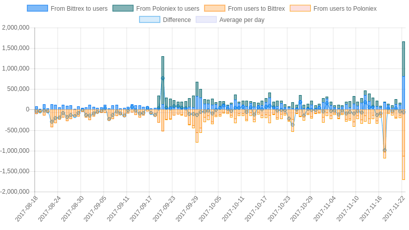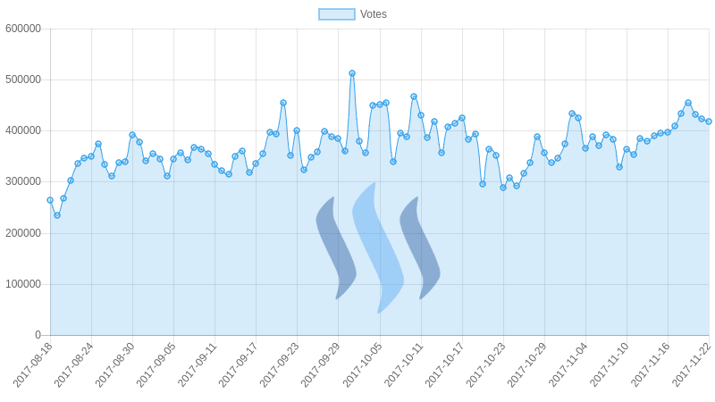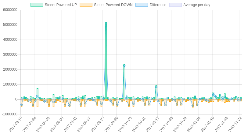 Welcome to my Steem Stats Report for Thursday, November 23, 2017. All data comes directly from the Steem blockchain and is based on UTC time. ## 1. Daily number of Posts (including comments)  Date | Posts --- | --- 2017-11-22 | 101,914 2017-11-21 | 110,890 2017-11-20 | 104,115 2017-11-19 | 100,076 2017-11-18 | 97,028 2017-11-17 | 102,586 2017-11-16 | 104,028 <center>https://steemitimages.com/DQmbNxNgXLda5QXpWfDZxP2d3XR498RxCgucZVMnrBVcw7g/image.png</center> ## 2. Daily number of votes  Date | Votes --- | --- 2017-11-22 | 417,490 2017-11-21 | 422,961 2017-11-20 | 431,432 2017-11-19 | 454,474 2017-11-18 | 433,640 2017-11-17 | 408,976 2017-11-16 | 396,972 <center>https://steemitimages.com/DQmbNxNgXLda5QXpWfDZxP2d3XR498RxCgucZVMnrBVcw7g/image.png</center> ## 3. Daily active users  Date | Active users --- | --- 2017-11-22 | 28,005 2017-11-21 | 27,586 2017-11-20 | 28,548 2017-11-19 | 25,733 2017-11-18 | 26,042 2017-11-17 | 27,510 2017-11-16 | 28,098 <center>https://steemitimages.com/DQmbNxNgXLda5QXpWfDZxP2d3XR498RxCgucZVMnrBVcw7g/image.png</center> ## 4. Posts + Comments per post  Date | Average # comments | Posts --- | --- | --- 2017-11-22 | 2.22 | 31,642 2017-11-21 | 2.59 | 30,866 2017-11-20 | 2.40 | 30,651 2017-11-19 | 2.46 | 28,916 2017-11-18 | 2.26 | 29,748 2017-11-17 | 2.19 | 32,131 2017-11-16 | 2.40 | 30,620 <center>https://steemitimages.com/DQmbNxNgXLda5QXpWfDZxP2d3XR498RxCgucZVMnrBVcw7g/image.png</center> ## 5. New accounts created  Date | New Accounts --- | --- 2017-11-22 | 1,514 2017-11-21 | 1,668 2017-11-20 | 1,952 2017-11-19 | 487 2017-11-18 | 894 2017-11-17 | 1,647 2017-11-16 | 1,944 <center>https://steemitimages.com/DQmbNxNgXLda5QXpWfDZxP2d3XR498RxCgucZVMnrBVcw7g/image.png</center> ## 6. Daily Amount of SBD converted to Steem  Date | Amount in SBD --- | --- 2017-11-22 | 3,347 SBD 2017-11-21 | 5,872 SBD 2017-11-20 | 5,029 SBD 2017-11-19 | 4,833 SBD 2017-11-18 | 8,665 SBD 2017-11-17 | 12,909 SBD 2017-11-16 | 2,037 SBD <center>https://steemitimages.com/DQmbNxNgXLda5QXpWfDZxP2d3XR498RxCgucZVMnrBVcw7g/image.png</center> ## 7. Daily Amount of Steem Powered UP & DOWN  Date | Powered UP | Powered DOWN | Difference --- | --- | --- | --- 2017-11-22 | 130,586 STEEM | 147,020 STEEM | -16,434 STEEM 2017-11-21 | 117,970 STEEM | 174,725 STEEM | -56,755 STEEM 2017-11-20 | 202,997 STEEM | 70,494 STEEM | 132,503 STEEM 2017-11-19 | 135,001 STEEM | 196,644 STEEM | -61,643 STEEM 2017-11-18 | 91,506 STEEM | 60,089 STEEM | 31,417 STEEM 2017-11-17 | 99,925 STEEM | 165,897 STEEM | -65,972 STEEM 2017-11-16 | 160,040 STEEM | 169,978 STEEM | -9,938 STEEM Average p/d | 231,175 STEEM | 224,905 STEEM | 6,269 STEEM <center>https://steemitimages.com/DQmbNxNgXLda5QXpWfDZxP2d3XR498RxCgucZVMnrBVcw7g/image.png</center> ## Largest 'Power ups' yesterday Date & Time | From | To | STEEM --- | --- | --- | --- Nov 22, 15:06 | @sweetsssj | @sweetsssj | 14,000.000 Nov 22, 05:41 | @freedom | @freedom | 9,517.389 Nov 22, 01:51 | @the.collector | @the.collector | 8,587.000 Nov 22, 01:39 | @sirvotesalot | @sirvotesalot | 8,380.141 Nov 22, 20:15 | @blocktrades | @emilezonneveld | 8,088.977 <center>https://steemitimages.com/DQmbNxNgXLda5QXpWfDZxP2d3XR498RxCgucZVMnrBVcw7g/image.png</center> ## 8. Daily Steem Transfers from and to exchanges  Date | From Bittrex | From Poloniex | To Bittrex | To Poloniex --- | --- | --- | --- | --- 2017-11-22 | 818,242 STEEM | 839,617 STEEM | 1,144,737 STEEM | 564,803 STEEM 2017-11-21 | 121,509 STEEM | 42,313 STEEM | 144,913 STEEM | 59,902 STEEM 2017-11-20 | 127,634 STEEM | 122,954 STEEM | 196,260 STEEM | 20,004 STEEM 2017-11-19 | 40,597 STEEM | 61,090 STEEM | 86,205 STEEM | 53,744 STEEM 2017-11-18 | 110,845 STEEM | 27,333 STEEM | 71,531 STEEM | 32,366 STEEM 2017-11-17 | 175,682 STEEM | 17,817 STEEM | 1,038,284 STEEM | 147,138 STEEM 2017-11-16 | 49,886 STEEM | 44,568 STEEM | 133,365 STEEM | 57,251 STEEM <center>https://steemitimages.com/DQmbNxNgXLda5QXpWfDZxP2d3XR498RxCgucZVMnrBVcw7g/image.png</center> ## 9. Steem Price Update   --- <center><sub>¯\\___(ツ)____/¯ *Follow me @penguinpablo for daily Steem statistics.*</sub></center>