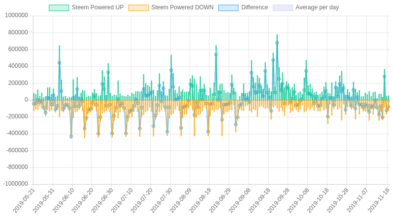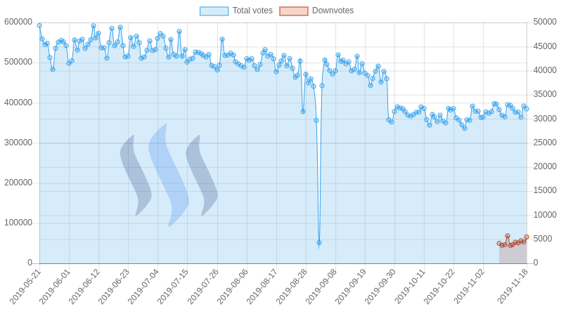 Welcome to my Steem Stats Report for Tuesday, November 19, 2019. All data comes directly from the Steem blockchain and is based on UTC time. ## 1. Daily number of Posts (including comments)  Date | Posts --- | --- 2019-11-18 | 33,147 2019-11-17 | 27,780 2019-11-16 | 28,522 2019-11-15 | 28,849 2019-11-14 | 29,993 2019-11-13 | 31,100 2019-11-12 | 31,574 2019-11-11 | 32,014 <center>https://steemitimages.com/DQmbNxNgXLda5QXpWfDZxP2d3XR498RxCgucZVMnrBVcw7g/image.png</center> ## 2. Daily number of votes  Date | Total votes | Downvotes | Percent downvotes --- | --- | --- | --- 2019-11-18 | 384,829 | 5,472 | 1.42% 2019-11-17 | 391,791 | 4,438 | 1.13% 2019-11-16 | 363,982 | 4,680 | 1.29% 2019-11-15 | 377,026 | 4,253 | 1.13% 2019-11-14 | 376,148 | 4,360 | 1.16% 2019-11-13 | 386,339 | 3,875 | 1% 2019-11-12 | 393,453 | 3,692 | 0.94% 2019-11-11 | 395,278 | 5,698 | 1.44% <center>https://steemitimages.com/DQmbNxNgXLda5QXpWfDZxP2d3XR498RxCgucZVMnrBVcw7g/image.png</center> ## 3. Daily accounts transacting  <sub>A 'transacting account' is a Steem account that made at least one transaction on the Steem blockchain. This can be a vote, post, comment, transfer, power up or sbd conversion. Users who only read from the Steem blockchain without interacting are not included. The actual number of 'Active users' is therefore much higher than the accounts transacting.</sub> Date | Accounts transacting --- | --- 2019-11-18 | 32,432 2019-11-17 | 32,429 2019-11-16 | 31,718 2019-11-15 | 33,124 2019-11-14 | 31,942 2019-11-13 | 33,313 2019-11-12 | 33,487 2019-11-11 | 33,233 <center>https://steemitimages.com/DQmbNxNgXLda5QXpWfDZxP2d3XR498RxCgucZVMnrBVcw7g/image.png</center> ## 4. Posts + Comments per post  Date | Average # comments | Posts --- | --- | --- 2019-11-18 | 2.67 | 9,025 2019-11-17 | 2.50 | 7,932 2019-11-16 | 2.70 | 7,703 2019-11-15 | 2.55 | 8,137 2019-11-14 | 2.54 | 8,479 2019-11-13 | 2.55 | 8,757 2019-11-12 | 2.68 | 8,574 2019-11-11 | 2.73 | 8,590 <center>https://steemitimages.com/DQmbNxNgXLda5QXpWfDZxP2d3XR498RxCgucZVMnrBVcw7g/image.png</center> ## 5. New accounts created  Date | New Accounts --- | --- 2019-11-18 | 535 2019-11-17 | 106 2019-11-16 | 105 2019-11-15 | 111 2019-11-14 | 144 2019-11-13 | 149 2019-11-12 | 124 2019-11-11 | 130 ## Who created the new accounts yesterday Account | Accounts created --- | --- [@steem](https://steemblockexplorer.com/@steem) | 442 [@steemmonsters](https://steemblockexplorer.com/@steemmonsters) | 29 [@steemhunt](https://steemblockexplorer.com/@steemhunt) | 13 [@blocktrades](https://steemblockexplorer.com/@blocktrades) | 8 [@oracle-d](https://steemblockexplorer.com/@oracle-d) | 5 [@fundition](https://steemblockexplorer.com/@fundition) | 4 <center>https://steemitimages.com/DQmbNxNgXLda5QXpWfDZxP2d3XR498RxCgucZVMnrBVcw7g/image.png</center> ## 6. Daily Amount of SBD converted to Steem  Date | Amount in SBD --- | --- 2019-11-18 | 3,892 SBD 2019-11-17 | 7,817 SBD 2019-11-16 | 10,101 SBD 2019-11-15 | 23,509 SBD 2019-11-14 | 6,227 SBD 2019-11-13 | 3,051 SBD 2019-11-12 | 2,752 SBD 2019-11-11 | 408 SBD <center>https://steemitimages.com/DQmbNxNgXLda5QXpWfDZxP2d3XR498RxCgucZVMnrBVcw7g/image.png</center> ## 7. Daily Amount of Steem Powered UP & DOWN  Date | Powered UP | Powered DOWN | Difference --- | --- | --- | --- 2019-11-18 | 52,598 STEEM | 131,182 STEEM | -78,584 STEEM 2019-11-17 | 45,655 STEEM | 170,426 STEEM | -124,771 STEEM 2019-11-16 | 368,228 STEEM | 90,298 STEEM | 277,930 STEEM 2019-11-15 | 34,398 STEEM | 240,728 STEEM | -206,330 STEEM 2019-11-14 | 69,156 STEEM | 142,221 STEEM | -73,065 STEEM 2019-11-13 | 72,253 STEEM | 245,430 STEEM | -173,177 STEEM 2019-11-12 | 23,036 STEEM | 114,499 STEEM | -91,463 STEEM 2019-11-11 | 98,945 STEEM | 102,365 STEEM | -3,420 STEEM Average p/d | 148,808 STEEM | 156,125 STEEM | -7,317 STEEM <center>https://steemitimages.com/DQmbNxNgXLda5QXpWfDZxP2d3XR498RxCgucZVMnrBVcw7g/image.png</center> ## Largest 'Power ups' yesterday Date & Time | From | To | STEEM --- | --- | --- | --- Nov 18, 18:23 | [@stevoperon](https://steemblockexplorer.com/@stevoperon) | [@stevoperon](https://steemblockexplorer.com/@stevoperon) | 24,597.179 Nov 18, 17:04 | [@bankofkorea](https://steemblockexplorer.com/@bankofkorea) | [@bankofkorea](https://steemblockexplorer.com/@bankofkorea) | 5,068.990 Nov 18, 15:37 | [@lasseehlers](https://steemblockexplorer.com/@lasseehlers) | [@lasseehlers](https://steemblockexplorer.com/@lasseehlers) | 1,982.569 Nov 18, 20:12 | [@ctime](https://steemblockexplorer.com/@ctime) | [@ctime](https://steemblockexplorer.com/@ctime) | 1,672.900 Nov 18, 22:25 | [@kapitanrejven](https://steemblockexplorer.com/@kapitanrejven) | [@kapitanrejven](https://steemblockexplorer.com/@kapitanrejven) | 1,279.237 Nov 18, 17:00 | [@victor-alexander](https://steemblockexplorer.com/@victor-alexander) | [@victor-alexander](https://steemblockexplorer.com/@victor-alexander) | 1,225.285 Nov 18, 10:01 | [@rlt47](https://steemblockexplorer.com/@rlt47) | [@rlt47](https://steemblockexplorer.com/@rlt47) | 1,120.000 <center>https://steemitimages.com/DQmbNxNgXLda5QXpWfDZxP2d3XR498RxCgucZVMnrBVcw7g/image.png</center> ## 8. Daily Steem Transfers from and to exchanges  <sub>Transfers from one exchange to another are excluded.</sub> Date | Transfers to exchanges | Withdrawals from exchanges | Difference --- | --- | --- | --- 2019-11-18 | 238,996 STEEM | 50,271 STEEM | 188,725 STEEM 2019-11-17 | 211,140 STEEM | 21,900 STEEM | 189,240 STEEM 2019-11-16 | 179,965 STEEM | 77,932 STEEM | 102,034 STEEM 2019-11-15 | 363,581 STEEM | 171,492 STEEM | 192,088 STEEM 2019-11-14 | 175,009 STEEM | 75,278 STEEM | 99,732 STEEM 2019-11-13 | 169,360 STEEM | 28,275 STEEM | 141,085 STEEM 2019-11-12 | 50,919 STEEM | 71,946 STEEM | -21,027 STEEM 2019-11-11 | 85,961 STEEM | 41,939 STEEM | 44,022 STEEM <center>https://steemitimages.com/DQmbNxNgXLda5QXpWfDZxP2d3XR498RxCgucZVMnrBVcw7g/image.png</center> ## Deposits and withdrawals by exchange yesterday Exchange | Deposits | Withdrawals | Difference --- | --- | ---