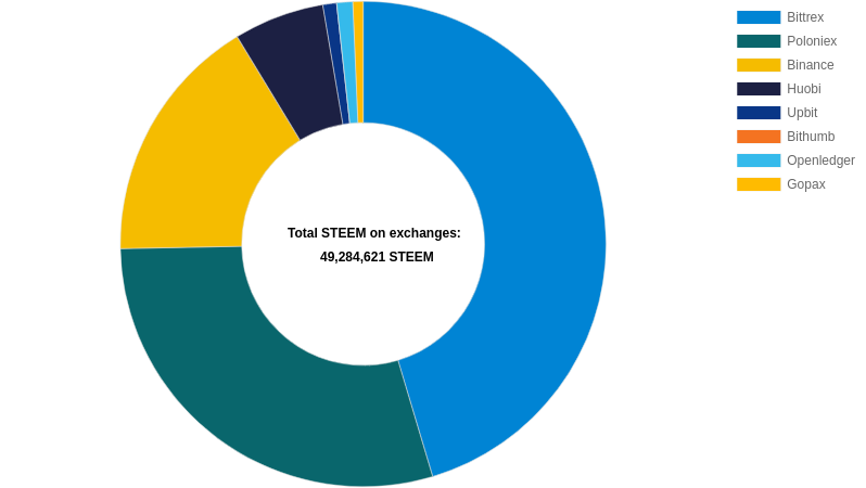 The charts below show how much STEEM is stored on each exchange where STEEM is listed. Deposits and withdrawals on Bithumb all still disabled. **Rule #1 in the crypto world: Don't store your cryptocurrencies on an exchange!** ## STEEM stored on all exchanges  <center>https://steemitimages.com/DQmbNxNgXLda5QXpWfDZxP2d3XR498RxCgucZVMnrBVcw7g/image.png</center> ## STEEM stored on Bittrex  <center>https://steemitimages.com/DQmbNxNgXLda5QXpWfDZxP2d3XR498RxCgucZVMnrBVcw7g/image.png</center> ## STEEM stored on Poloniex  <center>https://steemitimages.com/DQmbNxNgXLda5QXpWfDZxP2d3XR498RxCgucZVMnrBVcw7g/image.png</center> ## STEEM stored on Binance  <center>https://steemitimages.com/DQmbNxNgXLda5QXpWfDZxP2d3XR498RxCgucZVMnrBVcw7g/image.png</center> ## STEEM stored on Huobi  <center>https://steemitimages.com/DQmbNxNgXLda5QXpWfDZxP2d3XR498RxCgucZVMnrBVcw7g/image.png</center> ## STEEM stored on Upbit  <center>https://steemitimages.com/DQmbNxNgXLda5QXpWfDZxP2d3XR498RxCgucZVMnrBVcw7g/image.png</center> ## STEEM stored on Bithumb  <center>https://steemitimages.com/DQmbNxNgXLda5QXpWfDZxP2d3XR498RxCgucZVMnrBVcw7g/image.png</center> ## STEEM stored on Openledger  <center>https://steemitimages.com/DQmbNxNgXLda5QXpWfDZxP2d3XR498RxCgucZVMnrBVcw7g/image.png</center> ## STEEM stored on Gopax  <center>https://steemitimages.com/DQmbNxNgXLda5QXpWfDZxP2d3XR498RxCgucZVMnrBVcw7g/image.png</center> ## How much STEEM is currently stored on each exchange?  <center>https://steemitimages.com/DQmbNxNgXLda5QXpWfDZxP2d3XR498RxCgucZVMnrBVcw7g/image.png</center> Exchange | STEEM --- | --- Bittrex | 22,410,744 STEEM Poloniex | 14,479,958 STEEM Binance | 8,207,631 STEEM Huobi | 2,973,647 STEEM Upbit | 454,152 STEEM Bithumb | 0 STEEM Openledger | 525,777 STEEM Gopax | 334,466 STEEM Total amount of STEEM stored on all exchanges: 49,284,621 STEEM Total STEEM supply: 270,642,905 STEEM Liquid STEEM: 78,137,887 STEEM - 18.2% of the total supply is stored on the exchanges. - 63.1% of all liquid STEEM is stored on the exchanges. --- <center><sub>¯\\___(ツ)____/¯ *Follow me @penguinpablo for daily Steem statistics.*</sub></center>