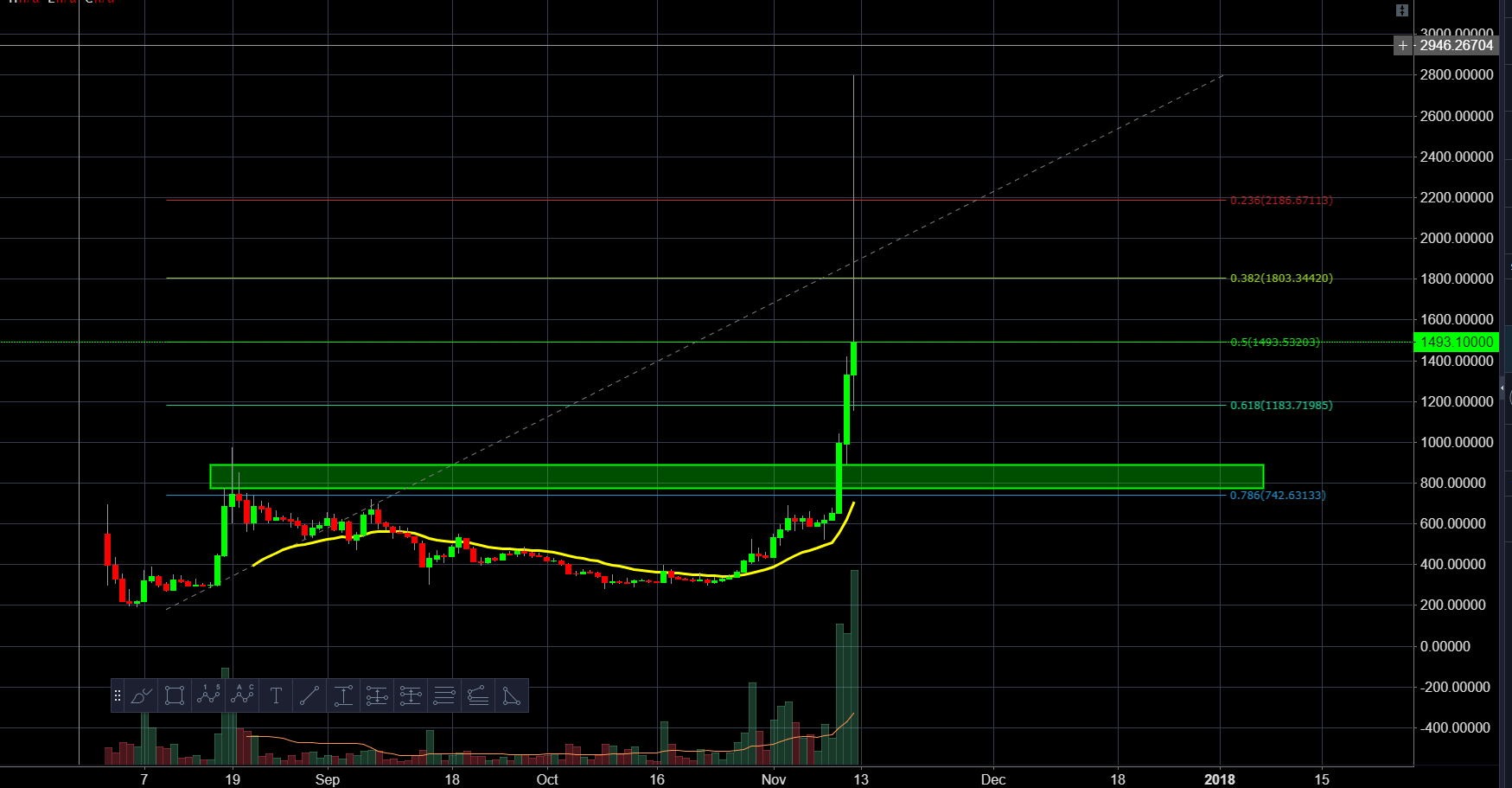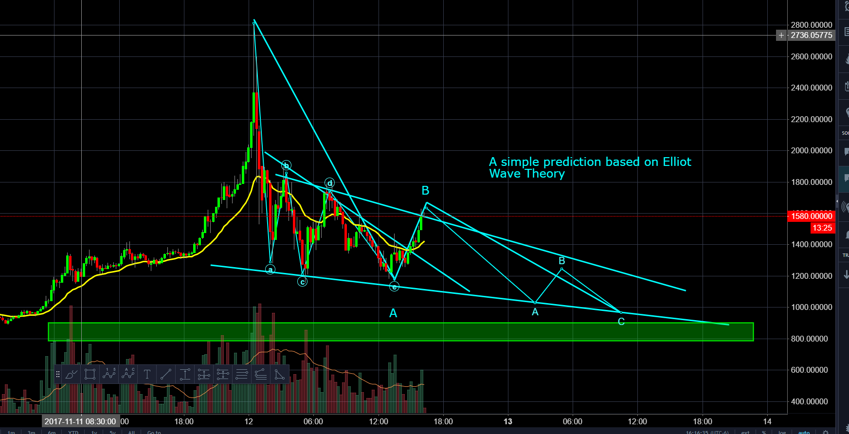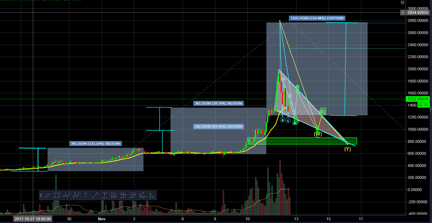 November 15 , 11 PM update. BCH is at $1075 and heading down. November 16, 5 PM update. BCH is now $890. Target aquired. Let's see how much further it can go. November 16, 8PM update, BCH found support @ $850 on Bitfinex. BAM. TA for life. Update over -------------  --------------------------Update over --------------------------- If you prefer the video version: https://youtu.be/fh3R7nXkQBQ Yesterday, I indicated best case scenerio, we'd hit exactly $2,800, using fib extension 1.618  What happened?  BAM Here's how targets were obtained in addition to using fib extension 1.618:  As an experienced trader, I take best and worst case scenarios. I never assume a single biased position. If we do this, we become biased and unprepared when the market does something against us. Though when we evaluate all possible ranges, it allows us to REACT to those conditions as they come to fruition. Think of a sports team. We plan for all cases and prepare, rather than simply predict only. Using BTC correlation techniques, we are now in a corrective process down to these levels indicated by a green box  We are now in an ABCDE corrective pattern for A, ready to move to B  We don't know exactly how wave C will look, in fact I'll bank on an extended correction with WXY patterns. Though with 100% certainty, we can say that the RSI daily is too high and a correction is overdue. My long position entry target is roughly $750-900. If it hits these targets, we'll be looking at a possible target of $3300 to $4500 next. Remember there are always winners and losers. We can't win them all, but we take high probability trade setups. Every decision you make is yours to make and the risk must be controlled and managed. Possible plays covered. I'm usually neither bullish or bearish. I react to the market and predict based on new data that comes in. I don't provide buy or sell signals. I point out facts from what the charts say. We don't aim to always be right. These are just my opinion. Always lots to learn as trading is a continuous growth process. It's important to share what we think and pass it on. Be open-minded. Constructive criticism is appreciated in a positive way, though negativity, hatred, and rants, aren't healthy in life. I cover in detail technical analysis, Elliot Wave, with price forecast. The ultimate goal is to help the crypto community because I think there's a lack of these type of videos. I want to share everything I've learned because knowledge is only power if passed on. If you enjoyed this video, donate to my Luna's piggy bank (the one who howls with me!): Luna's personal bitfinex account: Bitcoin Cash address: 1AY2FPANCe5URB71Nvy6tkCgoTS8iHgmZD BTC address: 1PruhmsYXU2gPkNw574xZSMyBG4YW5Wnq9 EOS Address: 0x2538b728f9682fc1dc2e7db8129730f661753850 ETP Address : MTR3P7m5KwHfE1aY51ha2YAQWQhRMPm1VA OMG Address: 0x2538b728f9682fc1dc2e7db8129730f661753850 Follow me on Twitter for some awesome play-by-play TA. Twitter - https://twitter.com/PhilakoneCrypto See my YouTube series for beginners: Starting $200, $1,600 in 16 Days. I'm not a financial adviser, nor am I giving you any tips on when to buy, sell, etc. I'm simply stating my opinions and what I personally look for.