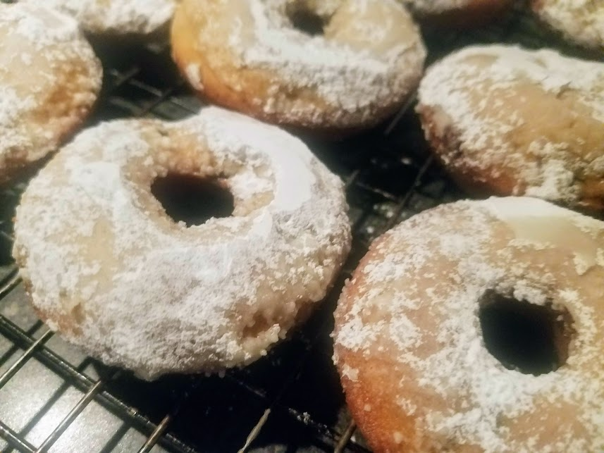 I love to experiment with my baked goods so after perfecting a [chocolate glaze](https://steemit.com/baking/@pinkspectre/chocolate-glaze-recipe) for my [chocolate chip donuts]( ), I decided to try my hand at a powdered sugar coating on some of the remaining donuts. In all honesty, I could not tell you which donut I preferred, the powder sugar dusted one, the chocolate glazed one, or the plain one. They were all delicious! But if you have a preference for powder sugar on your donuts, it’s so simple to achieve. Here’s how to do it: Ingredients: - ¼ cup powder sugar - 2 tablespoons melted unsalted butter 1. Place the butter in one shallow dish and the powdered sugar in another. Dip each donut in the butter, be sure to coat the entire top half. 2. With the buttered side facing down, place the donut in the sugar dish and swirl around quickly, then remove. 3. Enjoy your delicious powdered donuts.