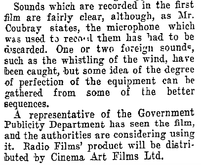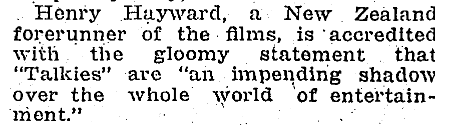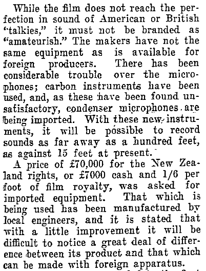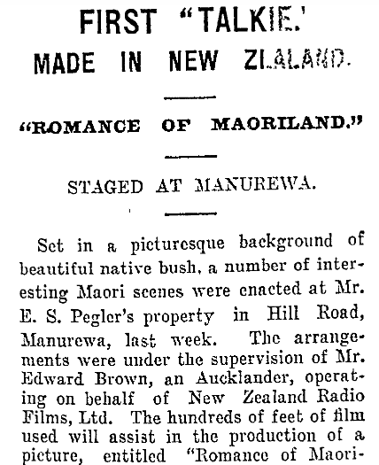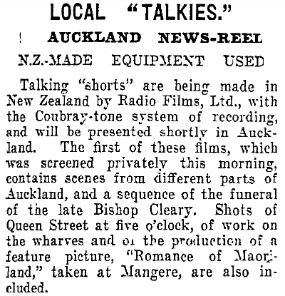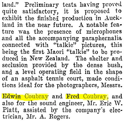 <center><h1>**COUBRAY-TONE NEWS**</h1></center> <center>It was the creation of **Edwin (Ted) Coubray** ( 19 October 1900 – 10 December 1997; sometimes noted as Edward) - a film-maker, theatre projectionist, and inventor born in Eastern Bush (Southland, NZ). </center> <center> *"Film-maker Ted Coubray and his brother Fred are shown here atop the New Zealand Radio Films sound truck in December 1929. They were filming the funeral of Henry Cleary, Roman Catholic bishop of Auckland."* [image source](https://teara.govt.nz/en/photograph/44150/the-coubray-brothers-at-work)</center> <center>The film debuted on the 3rd of January 1930, in the Plaza Theatre, Auckland. It featured clips on various subjects filmed around Auckland, including (as mentioned above) the funeral of Bishop Cleary. </center> <center>A write-up in one of the newspapers after an advanced screening of the film noted some interesting details about the film and its creation.    *AUCKLAND STAR, VOLUME LX, ISSUE 304, 24 DECEMBER 1929* [image source](https://paperspast.natlib.govt.nz/newspapers/AS19291224.2.128?end_date=31-12-1949&items_per_page=50&phrase=2&query=coubray&snippet=true&sort_by=byDA&start_date=01-01-1919)</center> <center>Excerpts from the film can be watched here: https://www.ngataonga.org.nz/collections/catalogue/catalogue-item?record_id=67532 </center> >Filmmaker Coubray began developing his own sound-on-film system following the arrival of ‘talkies’ in New Zealand in early 1929. After six months’ experimentation, and at a cost of £3000 (over $280,000 today), the Coubray-tone sound system was operational. This entirely New Zealand-made enterprise was the first of its kind in Australasia. [source](https://nzhistory.govt.nz/page/first-new-zealand-made-talkie-screened) <center> *A screenshot from the film* The Birth of New Zealand. [image source](http://www.nzmuseums.co.nz/account/3292/object/1568#prettyPhoto)</center> <center>Ted had already made several films before this first talkie one, including the popular *Carbine's Heritage* and *The Birth of New Zealand* (which had apparently been sent to Britain to have a soundtrack put to it, and Ted was disappointed when it came home with the sounds of *British* birds singing in the background).</center> <center> *Ted, as he appeared in the biographical documentary* Mouth Wide Open. [image source](https://www.nzonscreen.com/title/mouth-wide-open-ted-coubray-1998)</center> <center>It seems there was quite a polarising opinion over the 'talkie' films versus the traditional silent films. Even in New Zealand, as this poor unfortunate 'expert' was quoted in print with his doom-filled prediction.  *NZ TRUTH, ISSUE 1205, 3 JANUARY 1929* [full article](https://paperspast.natlib.govt.nz/newspapers/NZTR19290103.2.80.6?end_date=1931-12-31&items_per_page=50&phrase=2&query=talkies&snippet=true&sort_by=byDA&start_date=1929-01-01) It is a well-known fact that the evolvement of talking pictures in the film industry killed off the careers of many a popular actor or actress as they couldn't make successful transitions. If 'video killed the radio star' then talkies killed the silent star, but such is the price of progress.</center> ---------- **Notes:** Advertisers were quick enough to jump on the 'talkie' bandwagon, to take advantage of the new craze.  *NORTHERN ADVOCATE, 24 DECEMBER 1931* [image source](https://paperspast.natlib.govt.nz/newspapers/NA19311224.2.15.1?end_date=1931-12-31&items_per_page=50&page=2&phrase=2&query=talkies&snippet=true&sort_by=byDA.rev&start_date=1929-01-01) Ted's parents were **Nicholas Coubray**, and **Minnie Flowers**, and he had three brothers - Nicholas, Arthur, and Fred. Fred was Ted's camerman. Nicholas (the father) at one stage placed an advert in the newspaper, looking for relatives. I decided to add this because it is intriguing.  *STAR, ISSUE 7625, 7 FEBRUARY 1903* [image source](https://paperspast.natlib.govt.nz/newspapers/TS19030207.2.96.3?end_date=1918-12-31&items_per_page=50&page=3&phrase=2&query=coubray&snippet=true&sort_by=byDA.rev&start_date=1900-01-01) Things weren't always easy for Ted.  *MANAWATU TIMES, VOLUME XLVI, ISSUE 2528, 19 DECEMBER 1922* [source](https://paperspast.natlib.govt.nz/newspapers/MT19221219.2.65.7?end_date=31-12-1949&items_per_page=50&phrase=2&query=coubray&snippet=true&sort_by=byDA&start_date=01-01-1919) He had an enthusiasm for filming from a young age.  *MANAWATU STANDARD, VOLUME XLIII, ISSUE 233, 8 JANUARY 1921* [image source](https://paperspast.natlib.govt.nz/newspapers/MS19210108.2.10?end_date=31-12-1949&items_per_page=50&phrase=2&query=coubray&snippet=true&sort_by=byDA&start_date=01-01-1919) About the *Carbine's Heritage* film.  *AUCKLAND STAR, VOLUME LVII, ISSUE 294, 11 DECEMBER 1926* [image source](https://paperspast.natlib.govt.nz/newspapers/AS19261211.2.220?end_date=31-12-1949&items_per_page=50&phrase=2&query=coubray&snippet=true&sort_by=byDA&start_date=01-01-1919) A newspaper account of the making of his film *Romance of Maoriland*. The title states 'first talkie' but it wasn't the first one released. I imagine it was still in production when the news-reel came out.      *AUCKLAND STAR, VOLUME LX, ISSUE 280, 26 NOVEMBER 1929* [image source](https://paperspast.natlib.govt.nz/newspapers/AS19291126.2.19?end_date=31-12-1949&items_per_page=50&phrase=2&query=coubray&snippet=true&sort_by=byDA&start_date=01-01-1919) ---------- **Bibliography:** https://nzhistory.govt.nz/page/first-new-zealand-made-talkie-screened https://www.ngataonga.org.nz/collections/catalogue/catalogue-item?record_id=67532 https://www.ngataonga.org.nz/collections/catalogue/catalogue-item?record_id=73630 https://en.wikipedia.org/wiki/Edwin_Coubray https://teara.govt.nz/en/biographies/5c38/coubray-edwin https://www.nzonscreen.com/title/mouth-wide-open-ted-coubray-1998 https://paperspast.natlib.govt.nz/ ---------- <center> </center> <center></center> (extra tags: #life #education #minnowsupport #film)