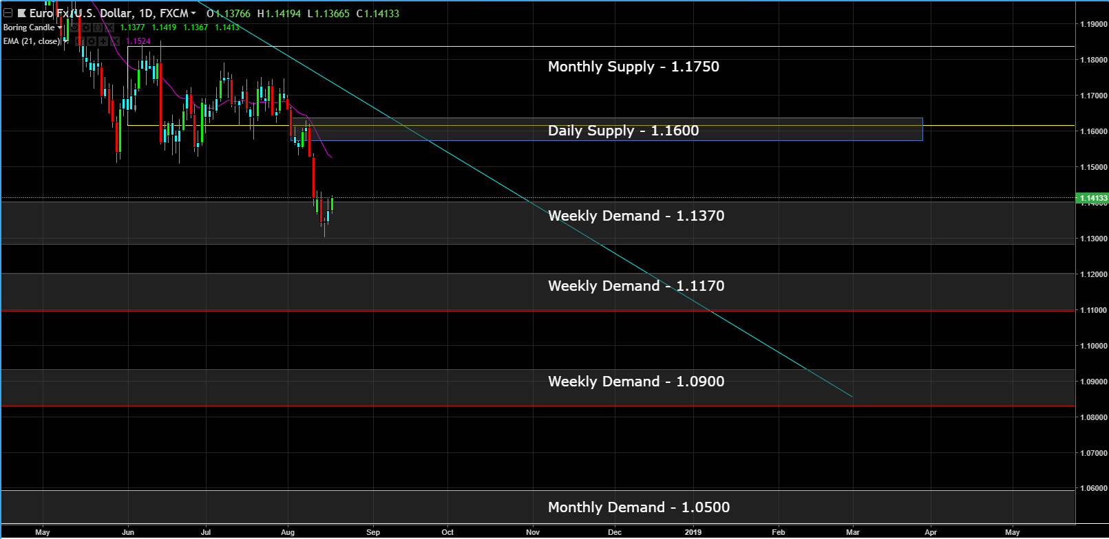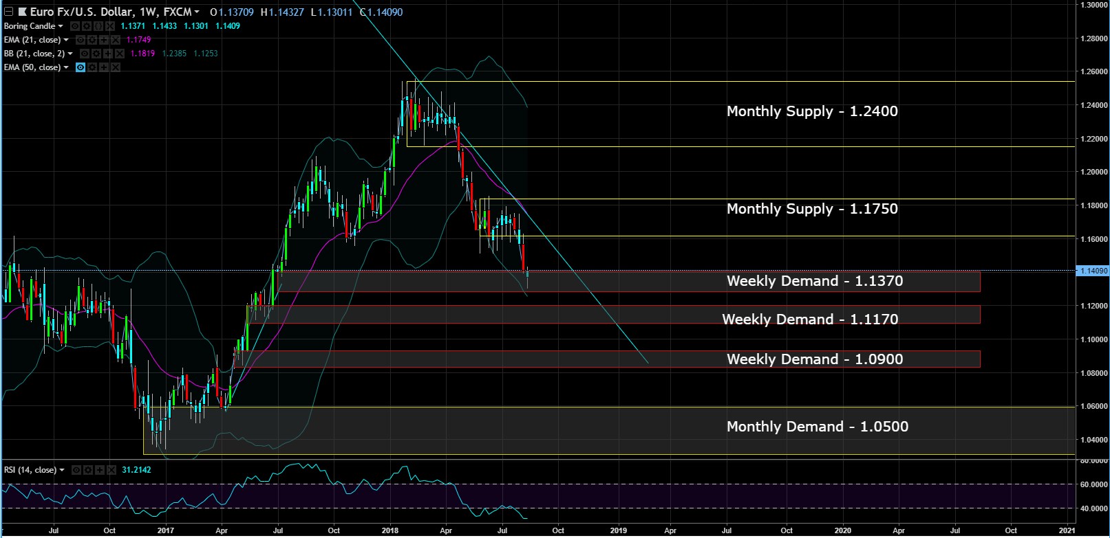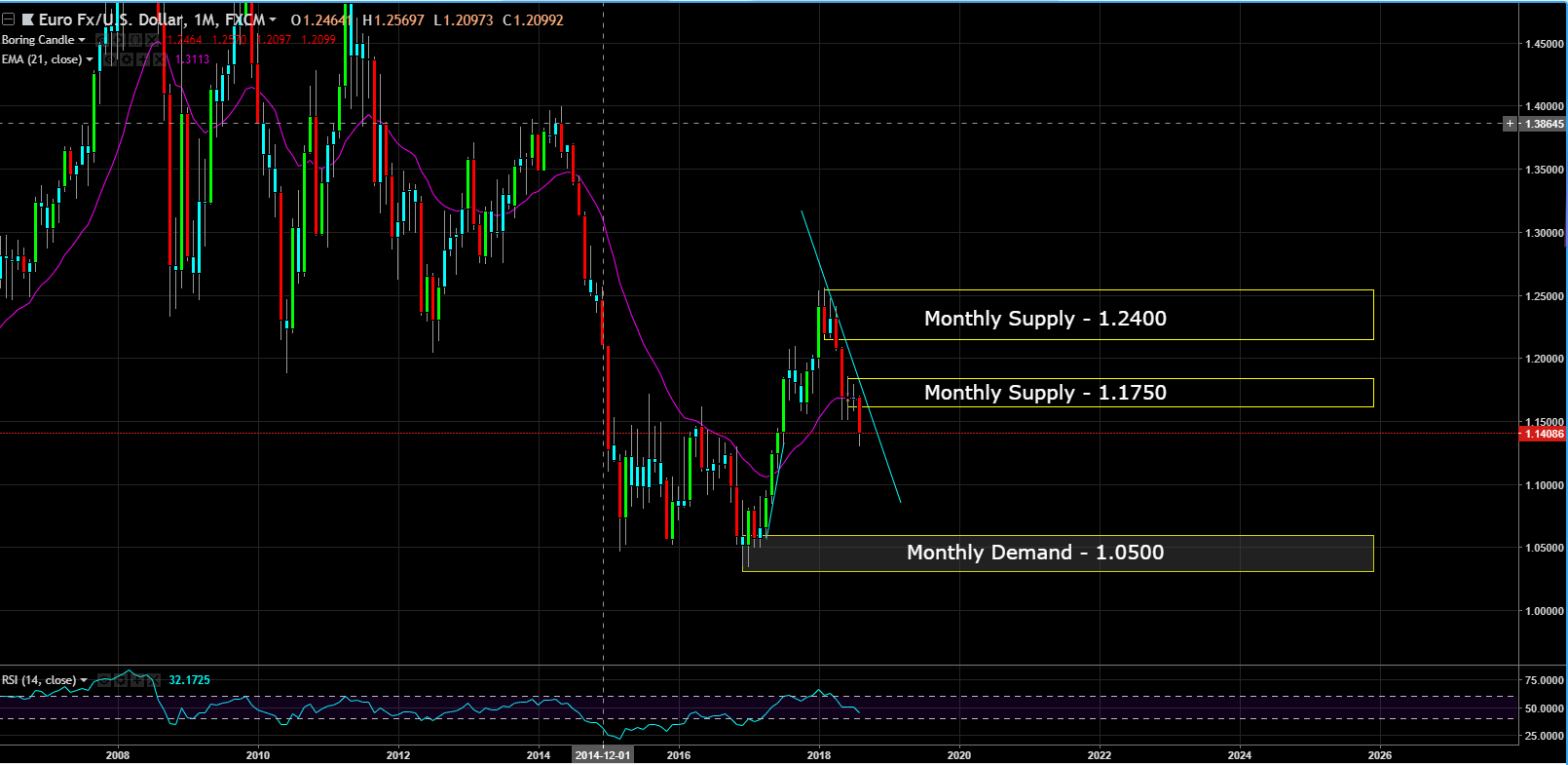 <center></center> Depending on who you ask, Euro benefits from individuals, businesses and whole countries by stabilizing prices for consumers and citizens, improving economic stability and growth and integrating financial markets. Many of these benefits are interconnected, so one has to take the good, also comes the bad. The driver appears to be emanating from Turkey, as concerns around financial conditions there have started to worry the ECB about exposure to the situation in European banks. Contagion in the European banking system is something that has long been a concern which is resurfacing now. Lets go to the charts to see how how this is affecting the EUR/USD. Monthly Chart (Curve Timeframe) – the nearest monthly supply is in the process of forming at 1.1750 and the monthly demand is at 1.0500.  Weekly Chart (Trend Timeframe) – the trend is down, price recently broke out to the downside from a two month consolidation, but price is reacting to the weekly demand at 1.1370 currently.  Daily Chart (Entry) – the chart suggest to short the EURUSD on the pull back to 1.1600. It's a round number, plus has the monthly supply zone backing the daily supply zone.  This post is my personal opinion. I’m not a financial advisor, this isn't financial advise. Do your own research before making investment decisions.  --- **Published on** <center><a href="https://mentormarket.io/"><img src="https://cdn.steemitimages.com/DQmXuk9bWMiPgXdowVfh4JBSGUXMqQkLa1u7ANwzTssgp25/250%20blue%20Overlay%206.png" alt="mentormarket.io" /></a> by [rollandthomas](https://mentormarket.io/profile/@rollandthomas)</center> --- <center><a href="https://mentormarket.io/legal/termsandconditions"><img src="https://cdn.steemitimages.com/DQmY5feG75MDWS57aX2rSUUa8bhzcZEyb5XKZCHY7FUzmXn/Disclaimer.png" alt="https://mentormarket.io/legal/termsandconditions" /></a></center>