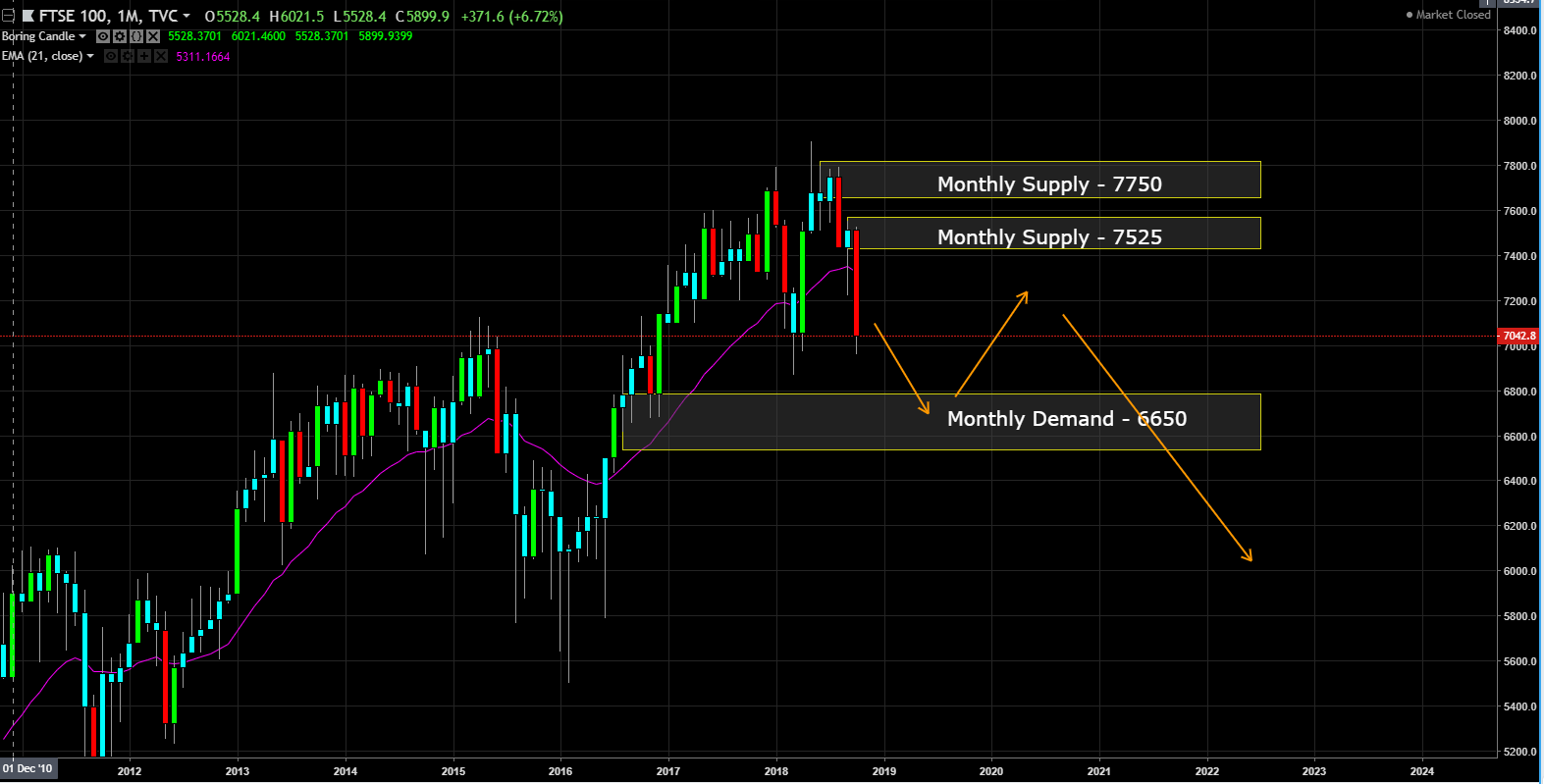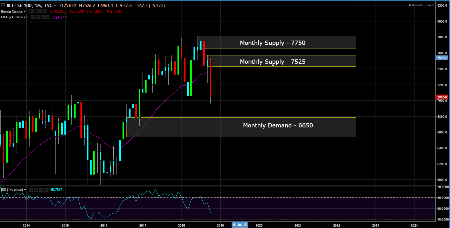 <center></center> The Financial Times Stock Exchange 100 Index, also called the FTSE 100 is a share index of the 100 companies listed on the London Stock Exchange with the highest market capitalization. >A third of FTSE-listed general retailers have issued profit warnings so far this year, according to research by EY highlighting the growing strain on the sector. >EY also warned that retailers face rises in business rates on their property and higher labour costs. >Travel and leisure companies have also been under pressure with a quarter of FTSE-listed firms in the sector issuing profit alerts. >'Renewed weakness in sterling or disruption to food or labour supply linked to Brexit could trigger a further wave of profit warnings,' EY added. <center>[Source](https://www.dailymail.co.uk/money/markets/article-6298667/1-3-retailers-listed-Footsie-report-warnings-profits.html?ITO=applenews)</center> Yes, the news and the profit warnings are bad, but that's not why I'm calling a top in the FTSE 100. The biggest advantages of trading the higher time frame charts are price action gets filtered, meaning the market noise and false signal are drastically reduced, allowing for the bigger picture to be clearer. As a result, trading signals become more accurate when trading on the higher timeframes. I consider myself a swing / position trader, which is why my multiple timeframe analysis is usually the monthly, weekly and daily charts. I use the monthly charts to tell me the trend, while the weekly tells me the momentum and the daily is where I refine my entry points. The FTSE 100 is showing something I have not seen in a very long time. Can you see what I'm see?  This is a level on level supply zone on the monthly chart. This is the strongest supply and demand concept . The chart suggest, price will go done to at least the monthly demand. The confirmation, will be if price bounces off the monthly demand, then continues to head lower.  This post is my personal opinion. I’m not a financial advisor, this isn't financial advise. Do your own research before making investment decisions.  --- **Published on** <center><a href="https://mentormarket.io/"><img src="https://cdn.steemitimages.com/DQmXuk9bWMiPgXdowVfh4JBSGUXMqQkLa1u7ANwzTssgp25/250%20blue%20Overlay%206.png" alt="mentormarket.io" /></a> by [rollandthomas](https://mentormarket.io/profile/@rollandthomas)</center> --- <center><a href="https://mentormarket.io/legal/termsandconditions"><img src="https://cdn.steemitimages.com/DQmY5feG75MDWS57aX2rSUUa8bhzcZEyb5XKZCHY7FUzmXn/Disclaimer.png" alt="https://mentormarket.io/legal/termsandconditions" /></a></center> This post is my personal opinion. I’m not a financial advisor, this isn't financial advise. Do your own research before making investment decisions.  --- **Published on** <center><a href="https://mentormarket.io/"><img src="https://cdn.steemitimages.com/DQmXuk9bWMiPgXdowVfh4JBSGUXMqQkLa1u7ANwzTssgp25/250%20blue%20Overlay%206.png" alt="mentormarket.io" /></a> by [rollandthomas](https://mentormarket.io/profile/@rollandthomas)</center> --- <center><a href="https://mentormarket.io/legal/termsandconditions"><img src="https://cdn.steemitimages.com/DQmY5feG75MDWS57aX2rSUUa8bhzcZEyb5XKZCHY7FUzmXn/Disclaimer.png" alt="https://mentormarket.io/legal/termsandconditions" /></a></center>