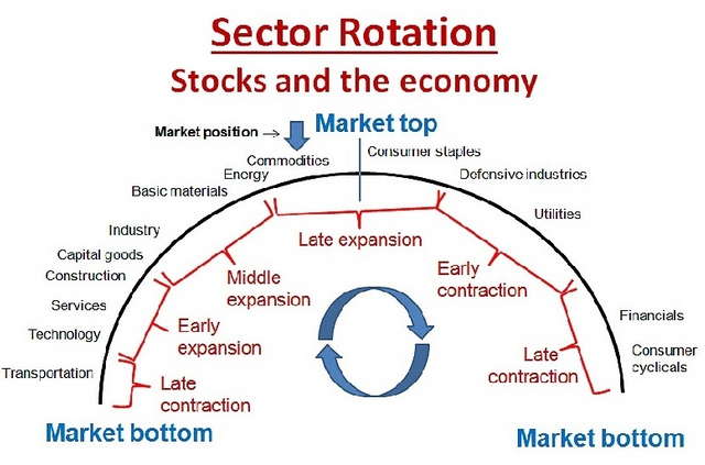 Sector rotation is the action of shifting investment assets from one sector to another to take advantage of cyclical trends in the overall economy in an attempt to beat the market. Sector rotation seeks to capitalize on the theory that not all sectors of the economy perform well at the same time because sectors of the stock market perform differently during the phases of the economic and market cycle.  For example, defensive sectors such as consumer staples, utility and health care stocks tend to outperform during a recessionary phase, while consumer discretionary and tech stocks tend to fare well during early expansions. When you trade, you want the strongest stocks in the strongest sectors, which is why you should monitor sector performance carefully. With that said, lets determine the relative strength of the sectors relative to the S&P 500 ETF, SPY for the upcoming week. For example, defensive sectors such as consumer staples, utility and health care stocks tend to outperform during a recessionary phase, while consumer discretionary and tech stocks tend to fare well during early expansions. When you trade, you want the strongest stocks in the strongest sectors, which is why you should monitor sector performance carefully. With that said, lets determine the relative strength of the sectors relative to the S&P 500 ETF, SPY for the upcoming week. Communication Services (XLC)  Consumer Discretionary (XLY)  Consumer Staples (XLP)  Energy (XLE)  Financials (XLF)  Health Care (XLV)  Industrials (XLI)  Materials (XLB)  Real Estate (XLRE)  Technology (XLK)  Utilities (XLU)  Based on the moving averages and the last daily closing price, relative to the moving averages,  the SPDR sectors' relative strength, relative to the SPY are the following:  <p> <br /> <img src="https://images.hive.blog/DQmVsxUBNSEttko3J3d7LDXL9BWGYLXLXAs798Z1EPjeUdf/image.png" /><br /> </p> <p>LeoFinance is a blockchain-based social media community for Crypto & Finance content creators. Our <a href="https://leofinance.io">tokenized app</a> allows users and creators to engage and share content on the blockchain while earning cryptocurrency rewards.</p> Posted Using [LeoFinance <sup>Beta</sup>](https://leofinance.io/hive-167922/@rollandthomas/spdr-sector-relative-strength-analysis-report-for-week-starting-8-16-21)