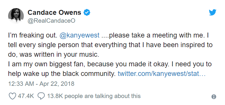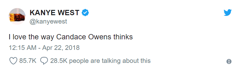 # Kanye West - Savior of Conservatism?  2 days ago on the 22nd of April, Kanye West shocked the world when he publicly showed support for black conservative speaker, Candice Owens.  For those of you who don't know, Candice Owens is a relatively famous conservative speaker who works with an organization called Turning Point USA, a conservative student advocacy group. She is most renowned for calling for black people to rise up and become self dependent, to stop relying on government handouts, and to stop playing the victim card. She has also heavily criticized the cop-killing organization *Black Lives Matter* as being a cancer to the black community. Video: https://twitter.com/RealCandaceO/status/987450257159077888  # What Does Kanyes Actions Mean For Us? As the know, the left has a strong presence in the entertainment industry, whether that be music or movies, almost everyone who has publicly shown their political standings, is anti-Trump and anti-Right. For Kanye to show the world his political opinion is a huge victory for conservatism, and could potentially see a wave of other actors and musicians follow his actions. # How Should We React? It is important that the public provides support on social media platforms, just to make sure that it doesn't look like Kanye is drowning himself in a sea of leftist hatred. Candice Owens has requested an interview with Kanye, which at this point, may seem likely so we can look forward to that as well.  Thanks for reading! Please UpVote and spread the word. This has potential to possibly sway some opinions.