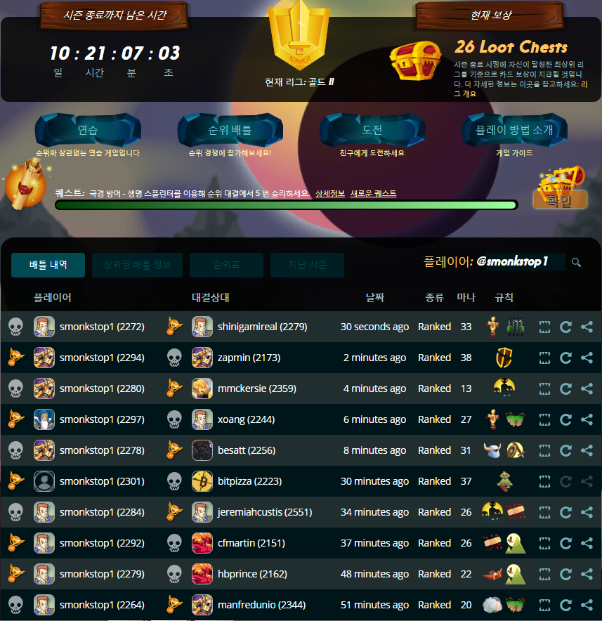 오늘의 Daily mission은 Life 덱으로 5승 하기 입니다. 미션 완료하였습니다.  보상으로 받은 체스트를 열어 보니 ..  이상입니다.