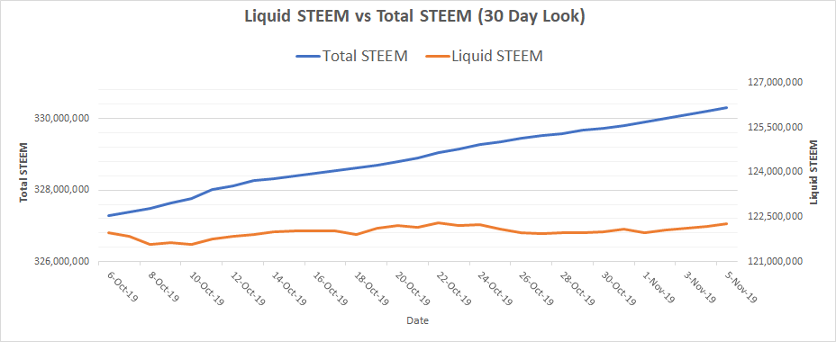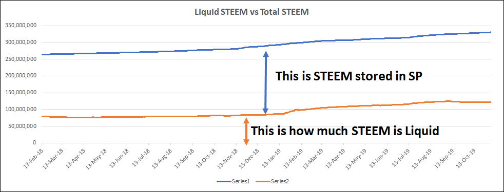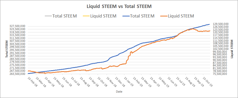 # This is a historical graph of both Total STEEM and Liquid STEEM supply   #### (Note) There are two different scales on these graphs. For full scale, see graph below. ### Liquid STEEM is the remaining STEEM that has not been converted into Steem Power. (Orange Line) * When STEEM is liquid, it can be readily sold and purchased. * When STEEM is locked away in SP, it is not liquid, It takes a significant amount of time to convert it back to a liquid form. # This is a graph of the same data. The data of this graph was plotted on the same scale to show the massive difference between Liquid STEEM and STEEM stored in SP  #### I created these charts with data that I collected over the last year and half. # Why are these graphs important? STEEM is created at a high rate. Currently **8.27%** per year. Many Steemians have a concern about STEEM inflation with the high rate of new currency creation. These graphs show that there is a limited supply of STEEM. Inflation is being offset by the rate of STEEM converted to Non-Liquid STEEM. # I hope you enjoyed reading my Blog. Please remember to Upvote, Resteem, and Follow. Thank you. # --------------------------------------- #### For a breakdown of Steemit Keys: https://steemit.com/life/@socky/do-you-understand-your-steemit-keys #### For a breakdown of why Steem Power is Important: https://steemit.com/steemit/@socky/why-is-steem-power-important-beginners-read #### How to improve STEEM payment system: https://steemit.com/steemit/@socky/introducing-the-hand-shake-and-how-it-can-revolutionize-steem-blockchain <center>[](http://steemitboard.com/board.html?user=socky) [](http://steemitboard.com/board.html?user=socky) [](http://steemitboard.com/board.html?user=socky) [](http://steemitboard.com/board.html?user=socky) [](http://steemitboard.com/board.html?user=socky) [](http://steemitboard.com/board.html?user=socky) [](http://steemitboard.com/board.html?user=socky)</center>