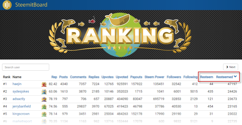 SteemitBoard Ranking update - Resteem and Resteemed added