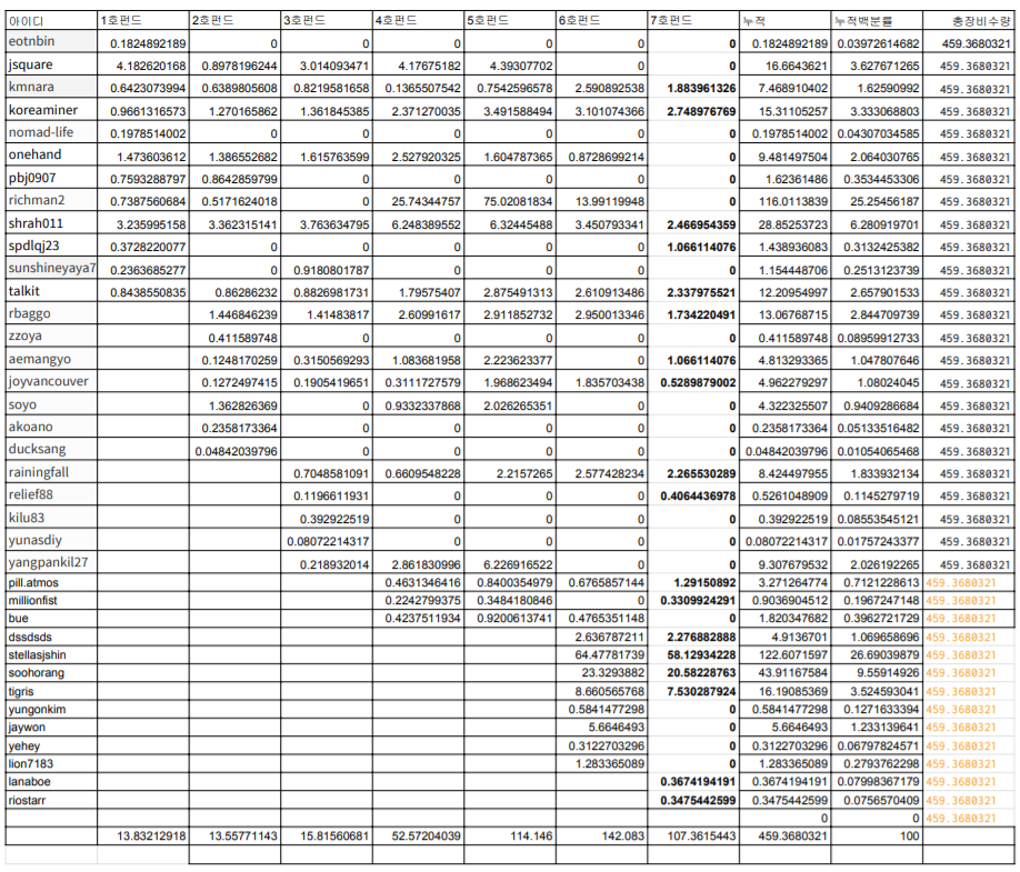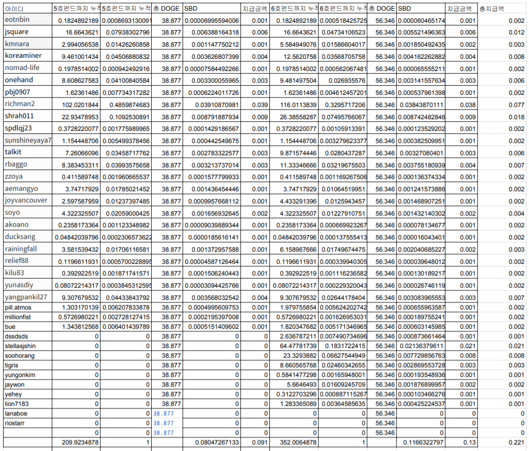 안녕하세요 스티미언 여러분 도연이 아빠 [@talkit](https://steemit.com/@talkit) 가야태자 입니다. EOBOT FUND를 운영하고 있습니다. 이번글은 53번째 글입니다. 9호 펀드의 6회차 글입니다. 앞으로도 한번더 보도록 하겠습니다. 9-5회차 : <https://steemit.com/eobotfund/@talkit/eobot-talkit-9-5> 9-4회차 : <https://steemit.com/eobotfund/@talkit/3f3zwz-eobot-talkit-9-3> 9-3회차 : <https://steemit.com/eobotfund/@talkit/eobot-talkit-9-3> 9-2회차 : <https://steemit.com/eobotfund/@talkit/eobot-talkit-9-2> 9-1회차 : <https://steemit.com/eobotfund/@talkit/eobot-talkit-9-1> 8-7회차 : <https://steemit.com/eobotfund/@talkit/eobot-talkit-8-7> 8-6회차 : <https://steemit.com/eobotfund/@talkit/eobot-talkit-8-6> 과거 글에도 보팅을 하실 수 있습니다. 혹시나 처음 들어오신 분은 과거 글에도 보팅 가능하십니다. ^^;; 앞으로도 최근 6회정도의 게시물을 링크하도록 하겠습니다. 펀드 운영 규칙은 다음과 같습니다. 1 . 보팅 하시면 됩니다. (0.01 부터 가능하십니다.) 2 . 매주 일요일 첫번째 투자는 2번째주 일요일에 투자를 진행 합니다. 3 . 투자 대상은 eobot의 클라우드 마이닝입니다. 4 . 프로그램을 작성하려고하지만, 처음에는 @보팅주사위2를 이용해서 진행하겠습니다. 5 . 투자 방법은 이 글의 스달과 스팀의 90%를 투자 합니다. 6 . 90%를 100으로 보고 80%는 기여도 대로 투자 합니다. (이때는 0.02 이상만 가능하십니다.) 7 . 90%를 100으로 보고 20%는 1/N 로 나눠서 투자합니다. (이 때는 0.01 이상이 가능 하십니다.) - 0.0으로 찍히시는 분들은 죄송 합니다. T.T - 7-7호 펀드까지 페이아웃 되었습니다. 일단 기록 하기 위해서 적어 둡니다.  - 위에서 보시는 바와 같이 SBD(90%)와 STEEM(90%) 금액을 투자 할 것 입니다. ^^;;  - 8-5호 까지 페이아웃 되었습니다. 8 . 펀드의 차수 별로 투자한후 5년간 매주 캐진 코인을 분배 합니다. - 5년간 해드리고 싶은데 혹시나 eobot과의 계약이 변경(지금 현재는 10년입니다. ^^) 되면 펀드의 수익금 지불이 중단 될 수 있습니다. 9 . 펀드를 이용해서 마이닝 하려고 하는 코인은 도지코인 입니다. 10 . 출금 해 드릴 수 있는 코인 도지코인(100코인 이상 1코인을 수수료로 받습니다. 제가 아니고 eobot에서 출금 수수료로 받습니다. ^^), 스팀코인, 스팀달러(도지코인을 스팀,스팀달러로 환전해서 90%를 드립니다.) 음 수정할 것이 여러가지네요 점점 확실하게 되여야 하니깐 스팀과 스달 형제 모두 가능하십니다. ^^;; 11 . 2회차글은 2-7회차 까지 쓰여졌습니다. 1주일 뒤에 또 페이아웃되면, 열심히 계산해서 기계를 사고 알려 드리겠습니다. 12 . 2주 부터는 2-7까지가 될 수 있을 것으로 생각 됩니다. 13 . 2주째 일요일에 일단 스달을 투자 합니다. 3주차 또는 4주차에 스팀을 파워 다운해서 투자 하도록 하겠습니다. (또는 제가 감당할 스달이면 제 스달로 투자를 먼저 진행 하겠습니다.) - 제가 감당할 수 있는 정도의 코인 양이라서 SBD와 STEEM을 모두 투자 했습니다. - 코인 가격이 좋아서 좀 더 많은 장비량을 샀으면 좋겠지만, 보시는 바와 같이 이번 회차에서는 13.8 정도의 장비를 구매 하였습니다. - 첫술에 배부르지 않을 것으로 생각 됩니다. 꾸준히 투자해주시면, 열심히 모아서 투자를 진행하고, 진행된 장비가 올라가면 출금이 잘 될 수 있을 것으로 기대 됩니다. 14 . 보팅봇 분들(busy 봇 등)은 펀드 지분율에서 제외하겠습니다. 15 . 현재까지 투자한 내역입니다. ^^;; - 1차 투자는 2018년 05월 27일(일요일) 오늘 투자를 진행했습니다. ^^;; - 2차 투자는 6월 3일에 진행했습니다. - 3차 투자는 6월 10일에 진행했습니다. - 4차 투자는 6월 17일에 진행했습니다. - 5차 투자는 6월 24일에 진행 했습니다. - 6차 투자는 7월 01일에 진행했습니다. - 7차 투자는 7월 08일에 진행했습니다. - 8차 투자는 7월 15일에 진행예정입니다. 16 . 제가 eobot에서 사용하고 있는 부계정을 사용하도록 하겠습니다 17 . 투자 결과 관련 된 것을 다음과 같이 하려고 합니다. - 재투자, 코인유지, 출금(도지코인, 스팀달러, 스팀) 위에 규정보시면, 도지코인은 100도지 이상, 스팀 형제는 90% 비율로 드립니다. 제가 봐서는 처음에는 출금이 안될 것으로 생각 되서, 출금이 가능하지 않으면 모든분들께 그냥 제가 스팀 달러로 분배해 드리고 합니다. - 재투자는 출금 가능 코인을 제가 계산 할껀데 보시고 재투자 결정을 해주시면 그걸로도 장비를 구매하겠습니다. 그리고, 그 장비는 그대로 본인 장비 GHZ에 포함되고 다음번 분배 될때 적용 됩니다. - 이번주까지 약 121코인 정도를 캤습니다. 이 21코인을 분배해 드리겠습니다. 이월하려고 했는데 ㅋㅋㅋ 제가 들어있는 모든 코인으로 장비를 사버리는 바람에 나눠드리고, 장비는 이번주까지 보팅하신 금액대로 지급해 드리겠습니다. 왜냐면 21코인치 장비가 얼마인지 몰라서 T.T 모든 분들께 그냥 골고루 ^^;; - 현재까지 차수별로 가지고 계신 장비 수량입니다.  - 이번주는 56.346 코인 정도를 캤습니다. - 이번주는 2주치를 계산해서 왔습니다. ^^;  - 맨 마지막 금액을 보내 드렸습니다. - 이번주도 많은 보팅 부탁 드립니다.    최초로 투자한 내역입니다.  두번째 투자 내역입니다. 지난주하고 비슷하게 장비가 사졌습니다. ^^            지금 장비와 엑셀 파일이 좀 안맞