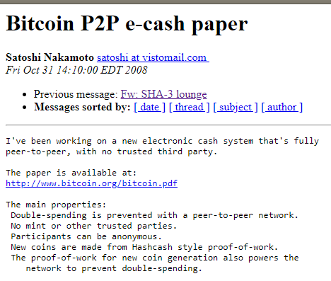 10 years ago, Satoshi Nakamoto announces Bitcoin. "I've been working on a new electronic cash system that's fully peer-to-peer, with no trusted third party." (Oct 31st 2008) [Promoted]