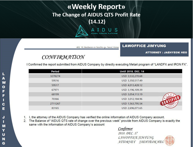 <div class="text-justify"> ## I. AIDUS The AIDUS Global D-Fund Platform is a decentralized fund market which create the environment for investors and asset management companies to collaborate with each other through the smart contract and the single currency system. ## II. AIDUS Purposes #### 1. A new decentralized fund market AIDUS project team aims to build the AIDUS Decentralized Fund Platform to serve the global investors and asset management companies with the criteria: 1. Allowing to implement the transactions via the decentralized fund platform based on the Blockchain technology. 2. Conducting the fund signing and redemption via the smart contract in quick and accuracy. 3. Offering the various portfolios with the verification. 4. Protecting the private data and asset of users with the high security. 5. Providing the flexible ways to access into decentralized fund platform by deploying both the website browser and mobile application version. 6. Serving users with the comprehensive services but in the minimum charges.  #### 2. A real value and unique cryptocurrency AIDUS project team plans to create the single key currency used on AIDUS decentralized fund platform – AIDUS coin (AID). Investors and asset management companies will use AIDUS coin for all activities and payments in AIDUS platform. AIDUS coin is issued with the objectives: 1. Facilitating the investments into the foreign portfolios. 2. Protecting coin holders by creating the fundamental for AIDUS coin. 3. Building the single currency system to assure the demand of AIDUS coin. #### 3. A high-profit solution This is always the highest purpose of any projects. AIDUS project aims to: 1. Provide the high-profit solution for asset management companies. 2. Coming with the solution is the high secure and stable profitability.  ## III. AIDUS solution #### 1. A decentralized fund market platform Blockchain is creating the revolutions in all industries. AIDUS project team has developed the blockchain-based decentralized fund platform to generate the opportunity for worldly investors and asset management companies to profit with the highest security features. Both investors and asset management companies are able to eliminate their doubt due to the transparent and verified information of their collaborating parties, which is powered by blockchain technology. #### 2. Smart Quant Trading System Quant Trading System (QTS) is automatic fund trading system, researched and developed for 15 years and implemented for 3 years, can generate continuous and safe yield rate for asset management companies. QTS has actually brought the high profit which is proven by Lawoffice JimYung.  ## IV. Benefits of AIDUS #### 1. For investors 1. Easily access to the fund information with the various languages. 2. No need to exchange for foreign investments. 3. Effortlessly request for a redemption and reinvestment at maturity or mid-term of investment period. 4. More opportunity to approach the high yield foreign portfolios. 5. One-time registration to participate in multiple asset management portfolios and acquiring the high secure privacy for the information. #### 2. For asset management companies 1. Only prepare the fund portfolio information. 2. Free access to the fund platform which has thousands of potential investors around the world. 3. Ability to attract more and more investors and expand the business with the high profit and secure portfolios. #### V. AIDUS ICO details: Token name | AIDUS -|- Token Symbol | AID Total supply | 20,000,000,000 AID Start date | October 1, 2018 End date | January 31, 2019 Soft cap | $ 3,000,000 USD Hard cap | $ 20,000,000 USD ## VI. AIDUS team    ## VII. AIDUS partners  </div> ## AIDUS Social Media Channels Official website: https://aidus.io Whitepaper: https://d2ao5bnwtor39o.cloudfront.net/pdf/White_Paper_PDF/AIDUS_White_Paper_eng.pdf Facebook: https://www.facebook.com/AIDUSofficial Twitter: https://twitter.com/AIDUSofficial Reddit: https://www.reddit.com/user/AIDUSofficial Telegram: https://t.me/aidusofficial YouTube: https://www.youtube.com/channel/UCO49UEg0xY3K933dkcfhZEA Bitcointalk: https://bitcointalk.org/index.php?topic=5080132 Author: tuthienloc92bk Bitcointalk profile: https://bitcointalk.org/index.php?action=profile;u=2135870