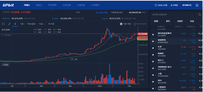 하락을 만회하고 20선 회복해준 코스피 차트입니다.  마찬가지로 급격한 하락을 급상승으로 회복하고 20선 가까이 올라온 코스닥입니다. 증시 상황은 전체적으로 횡보국면에 가까워진 모습입니다. 추세가 무너졌다고 볼 필요는 없고, 실적에 맞춰 조금 쉬어가는 모습입니다.  비트는 여전히 역프가 5프로 정도 되는 모습입니다. 뭔가 위의 증시차트와 크게 다르지 않은 모습입니다. 개인의 비중이 커지면서 전체적인 움직임이 증시와 코인이 크게 다르지 않아보이는 상황입니다. 24시간 열리는 코인시장을 참고해서 증시에 대응하는것도 나쁘지 않아 보일 정도입니다. 미국의 재정정책은 확실한 경기회복과 코로나 종식 이전에는 시장에 우호적일 것이라고 봅니다. 지금은 중국의 재정정책에 좀더 신경을 쓰시면서 대응하시는게 좋지 않을까 합니다. 현명한 선택하셔서 좋은 결과 얻으시길 바랍니다.