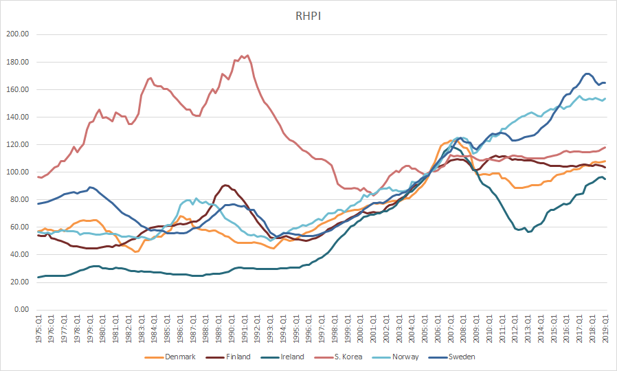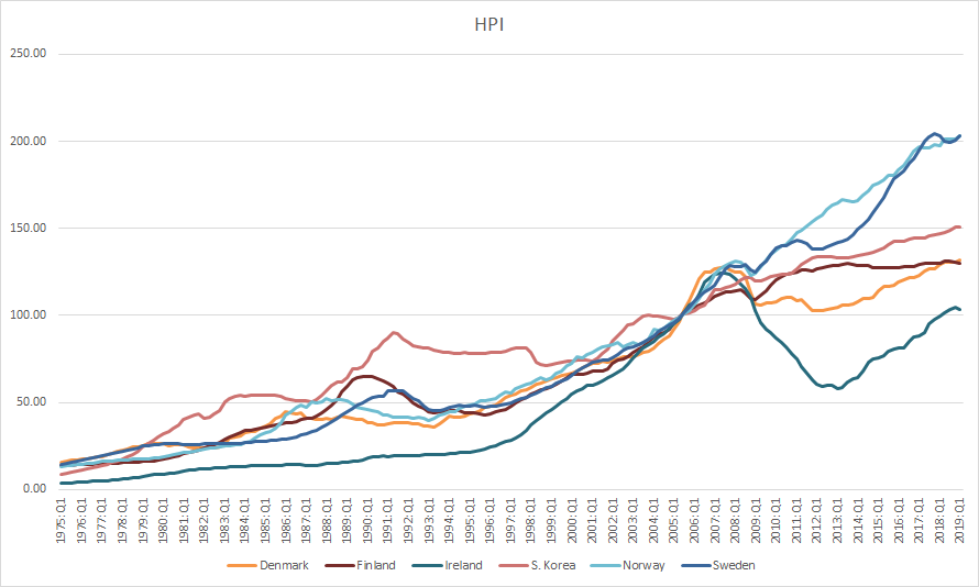 https://steemitimages.com/DQmQiWusqKWKoAF3wWnSPooPUsAeRdcXHpSQEqKbFBoxdhP/image.png <center> *illustration by @leesongyi* </center> *** 북유럽 5개 국가(덴마크, 핀란드, 아일랜드, 노르웨이, 스웨덴)의 명목주택가격지수와 실질주택가격지수를 비교한 차트입니다. 참고로 우리나라를 추가하였습니다. 각 국가의 2005년도 주택가격을 100으로 두고 그 전과 그 후를 비교한 그래프이므로, 각국의 주택가격지수를 절대적인 수치로 비교하기는 어렵습니다. ## 명목주택가격지수(HPI) the house price index (HPI)  ## 실질주택가격지수(RHPI) the house price index expressed in real terms (RHPI)  - 2005년도 주택가격지수를 100으로 두었을 때, 2019년 1분기 주택가격지수는 스웨덴 165.2, 노르웨이 153.4, 덴마크 107.9, 핀란드 103.7, 아일랜드 95.2인데, 2005년 이후 각국의 경제 성장이 고스란히 보여주는 지표로 보입니다. - 참고로 우리나라는 117.9입니다. 2009년 2분기를 저점으로 몇 차례 상승과 조정을 거치는 중이나 전반적으로는 상승 국면으로 볼 수 있습니다.