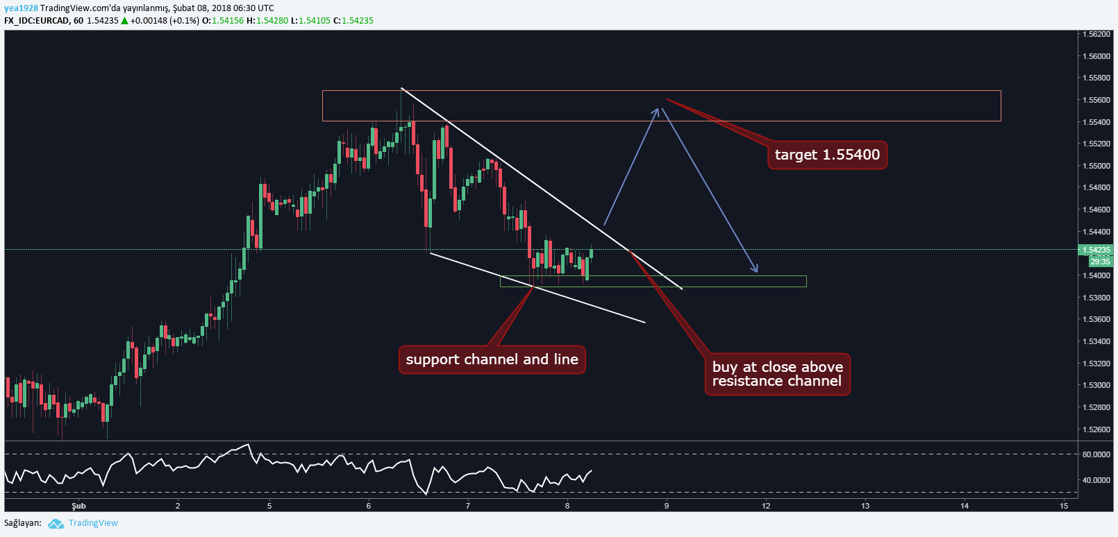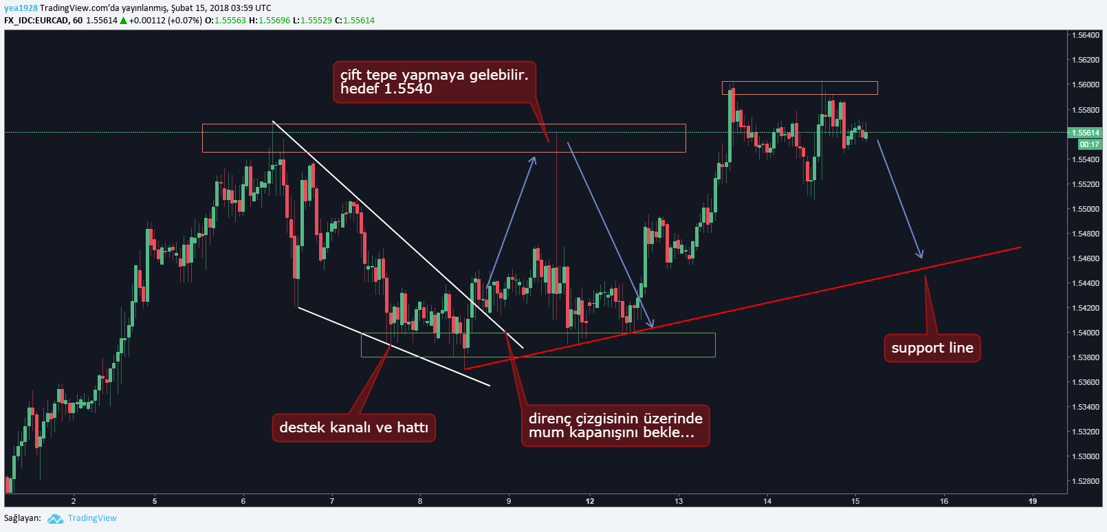 hi! feb 8 (before)  analysis: https://tr.tradingview.com/chart/EURCAD/5WykvvLD/ post: https://steemit.com/money/@yuemay/eurcad-h1-descending-wedge after  double top. it may come to test the support line.
